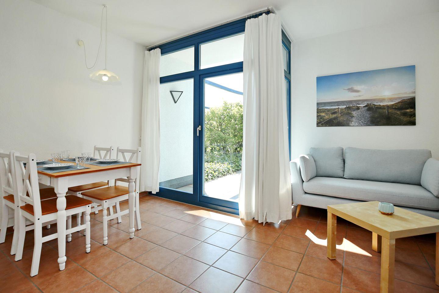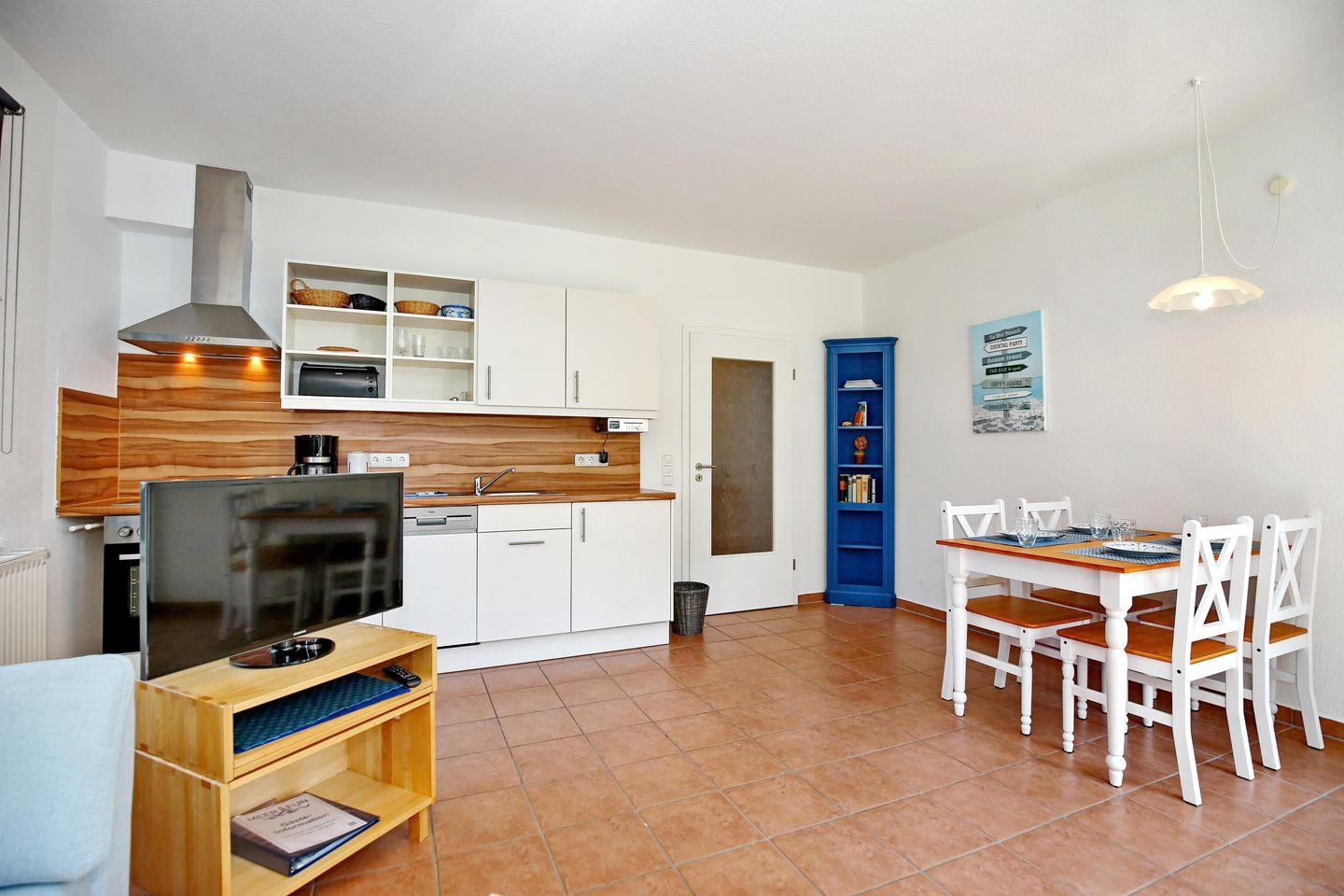 Die zur Straßenseite gelegene Ferienwohnung 2 im Haus „Bull“ ist eine 3-Zimmer-Wohnung und bietet auf 55 m² bis 4 Personen Platz für schöne Urlaubstage. Die Wohnung befindet sich im Erdgeschoss und teilt sich in einen Wohn- und Essbereich, eine Küchenzeile, 2 Schlafzimmer und ein Duschbad auf. Auf der begrünten Süd-Terrasse kannst du die Sonne genießen. Zum Strand gehst du etwa 650 Meter.