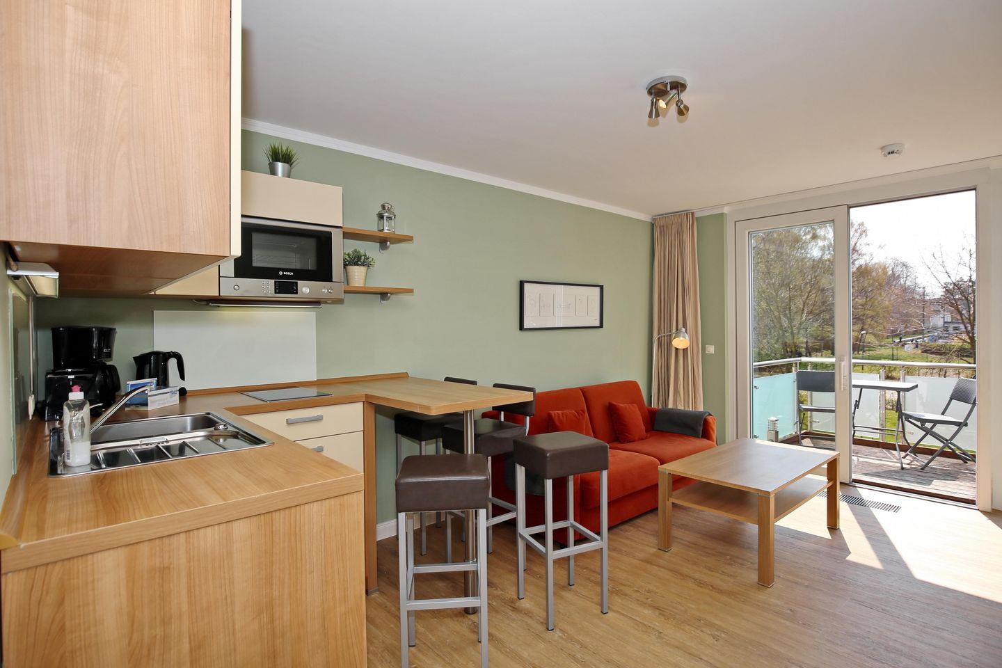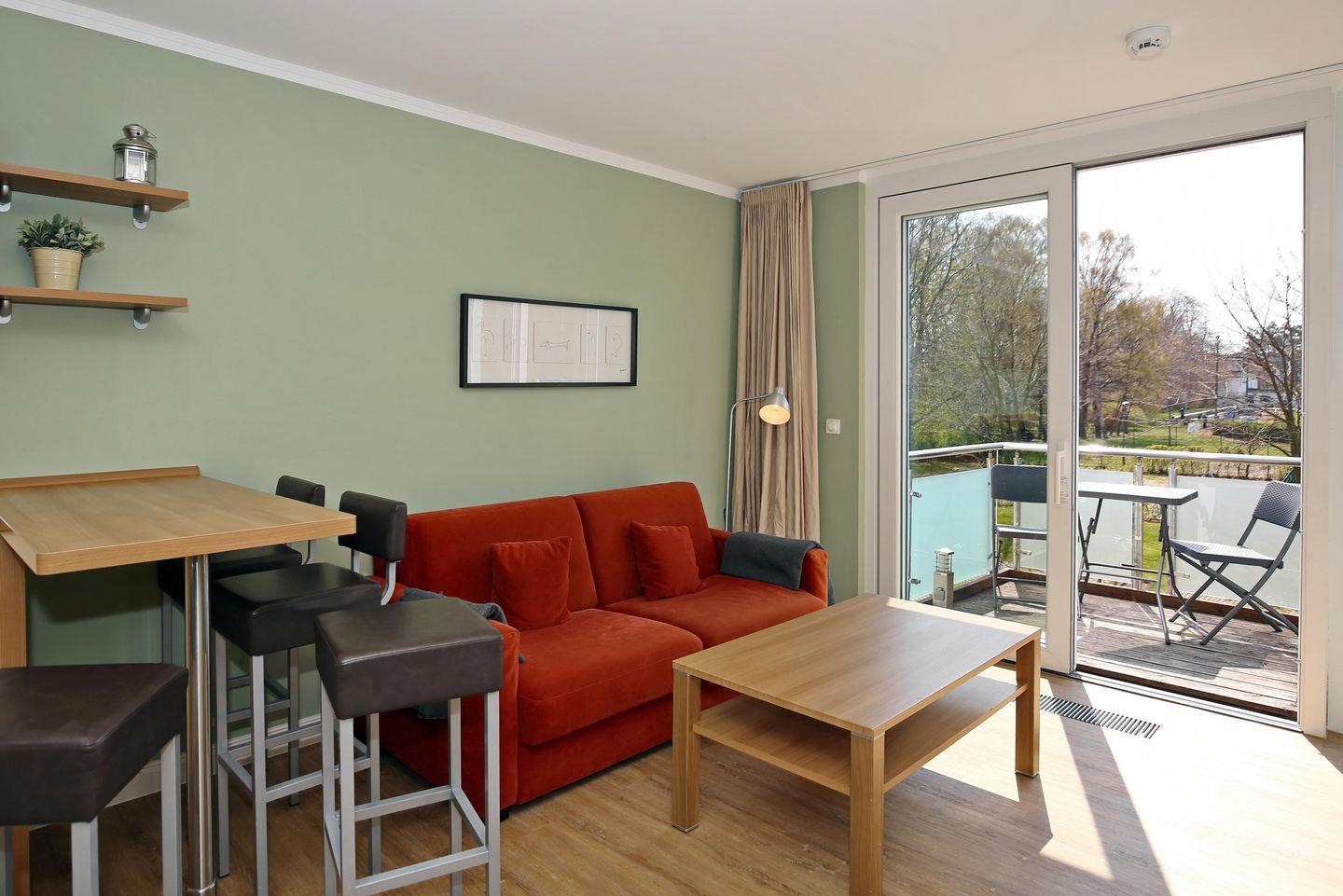 Der Wohnbereich ist mit einer Doppelschlafcouch (160 cm x 190 cm), auf der bequem 2 Personen schlafen können, zwei Korbsessel sowie einem Couchtisch, einem Flachbild-TV und einer Stereoanlage mit Dockingstation eingerichtet. Vom Wohnbereich aus gelangst du auf den Südbalkon. Außerdem steht dir kostenfreies WLAN zur Verfügung.