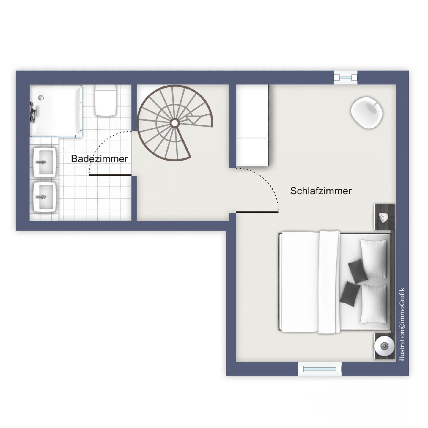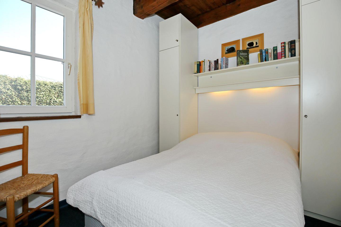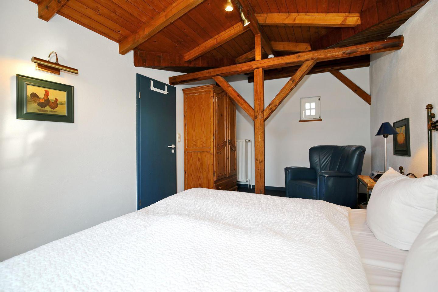 Das Schlafzimmer im Erdgeschoss ist mit einem Doppelbett (140 x 200 cm) und einem Einbaukleiderschrank eingerichtet. Im Schlafzimmer, das sich im Obergeschoss befindet, lädt ein Doppelbett (2 x 90 x 200 cm) zum erholsamen Schlaf ein. Hier bietet ein freistehender Kleiderschrank viel Stauraum für deine Sachen. An den Fenstern sind Vorhänge als Sichtschutz vorhanden.