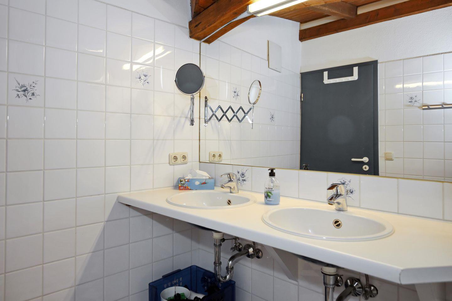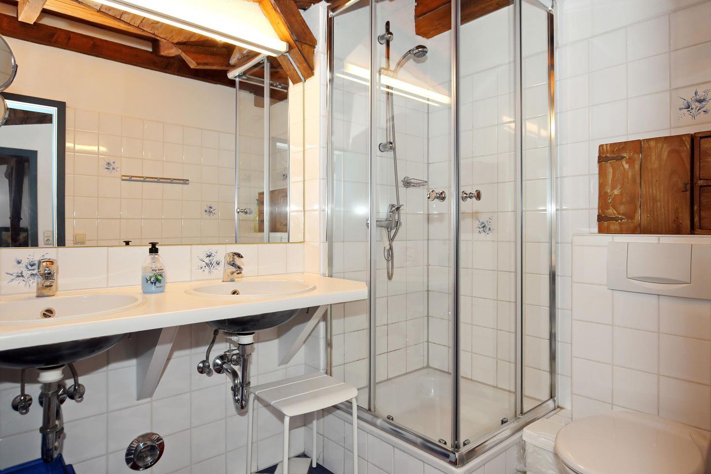 Ebenfalls im Obergeschoss der Ferienwohnung befindet sich das Duschbad mit WC. Ein Doppelwaschtisch mit großem Spiegel und einem Kosmetikspiegel gehören ebenso zur weiteren Einrichtung des Bades wie ein kleines Regal für deine Waschutensilien. Das Bad, die Küche sowie der Wohn- und Essbereich sind gefliest. Ein Teppich im Essbereich sorgt für Behaglichkeit. In den Schlafzimmern ist Teppichboden verlegt.