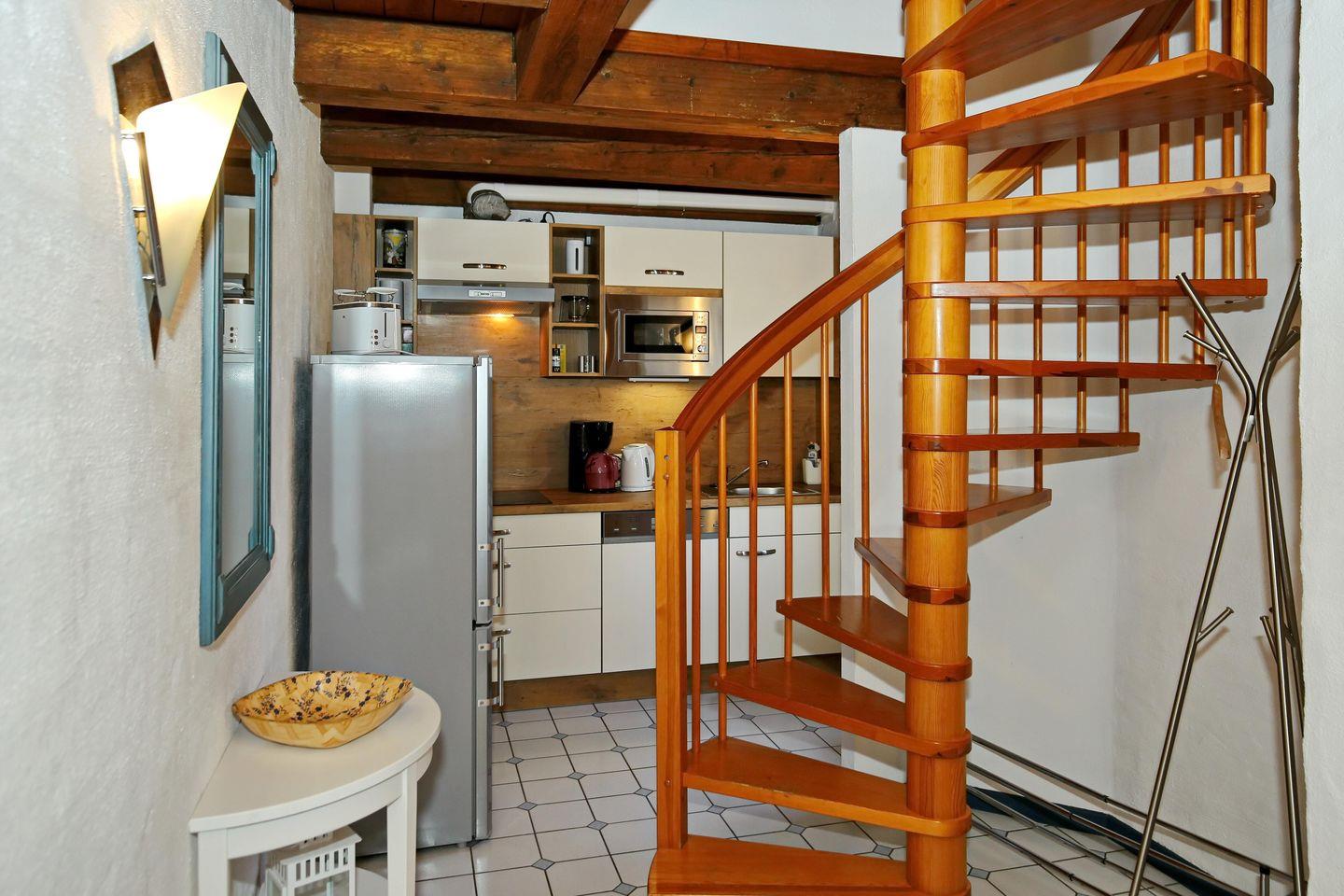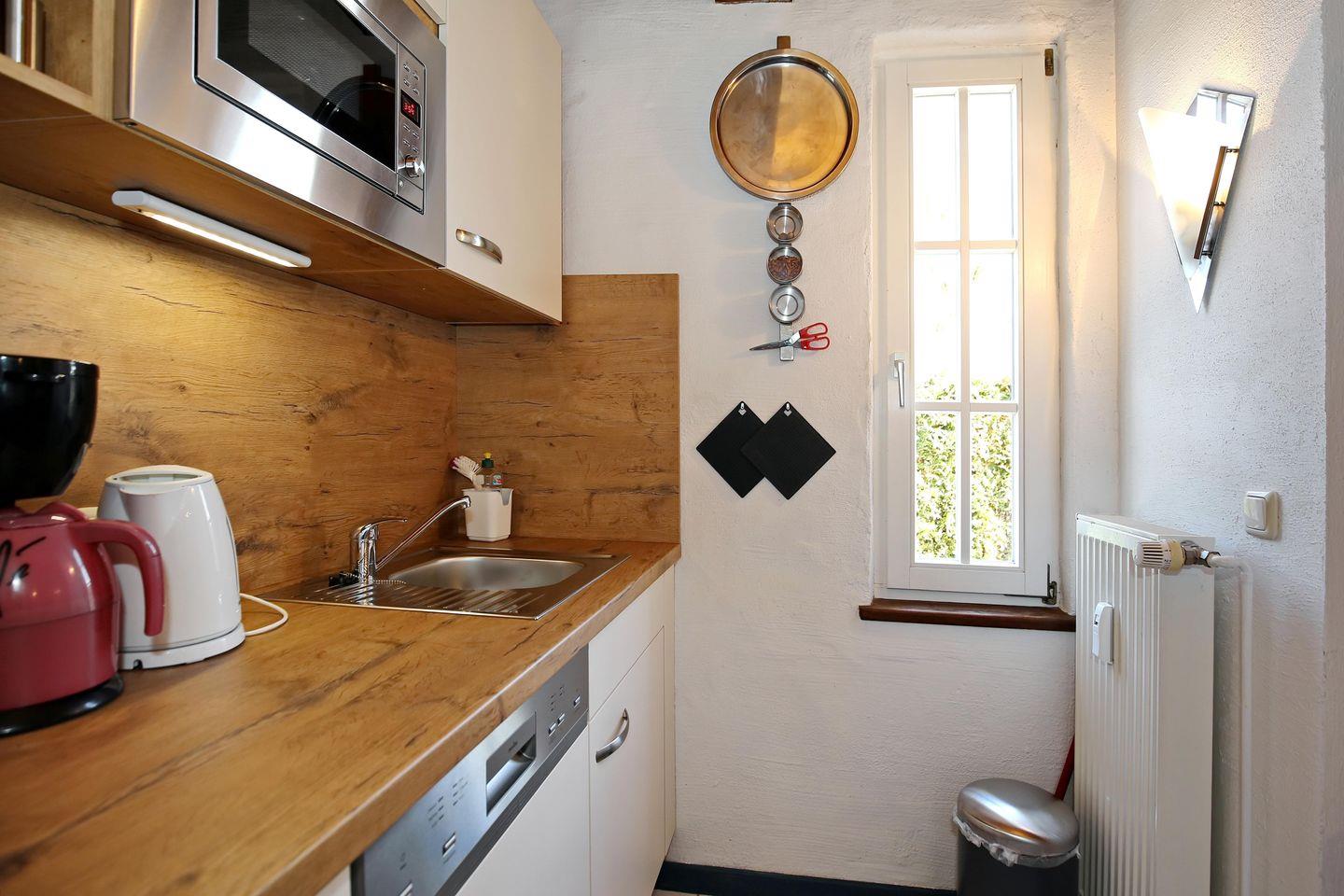Die offene und freundlich helle Küche der Ferienwohnung verfügt über ein 4-Platten-Cerankochfeld, eine Mikrowelle mit Grillfunktion, einen kleinen Backofen, einen Geschirrspüler und eine Kühl-Gefrierkombination mit drei Tiefkühlfächern. Ein Toaster, eine Kaffeemaschine sowie ein Wasserkocher komplettieren die Ausstattung der Küche.
