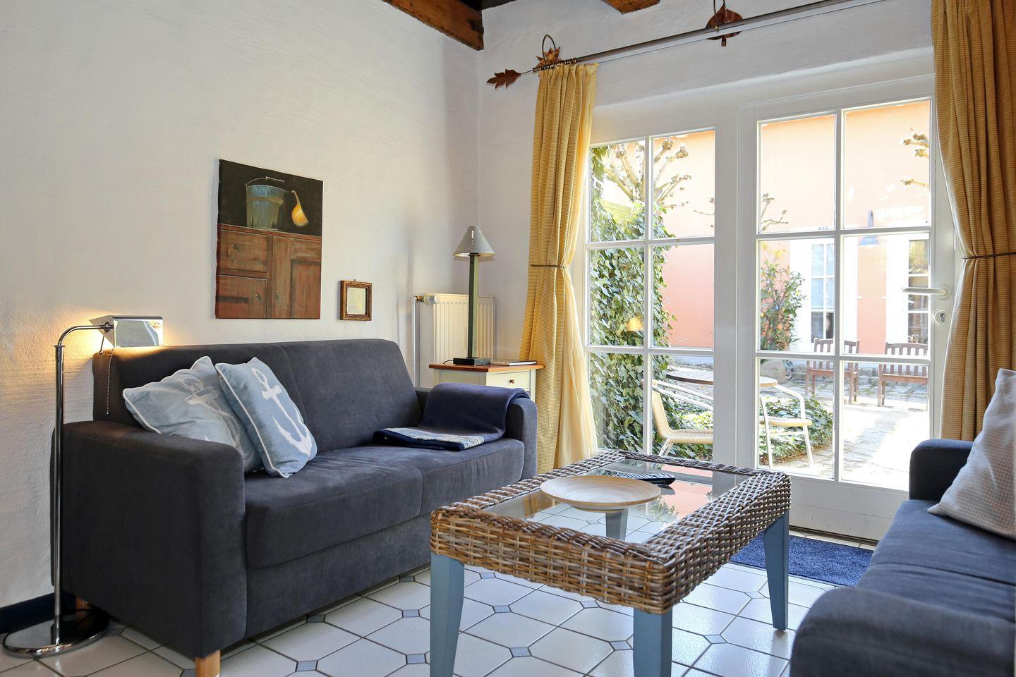 Die 3-Zimmer-Ferienwohnung 16 „Auf den Höfen“ mit 55 m² für bis zu 4 Personen verfügt über eine Terrasse und verläuft über 2 Etagen. Die Fenster sind mit Insektenschutzgittern ausgestattet. Haustiere sind nicht erlaubt.