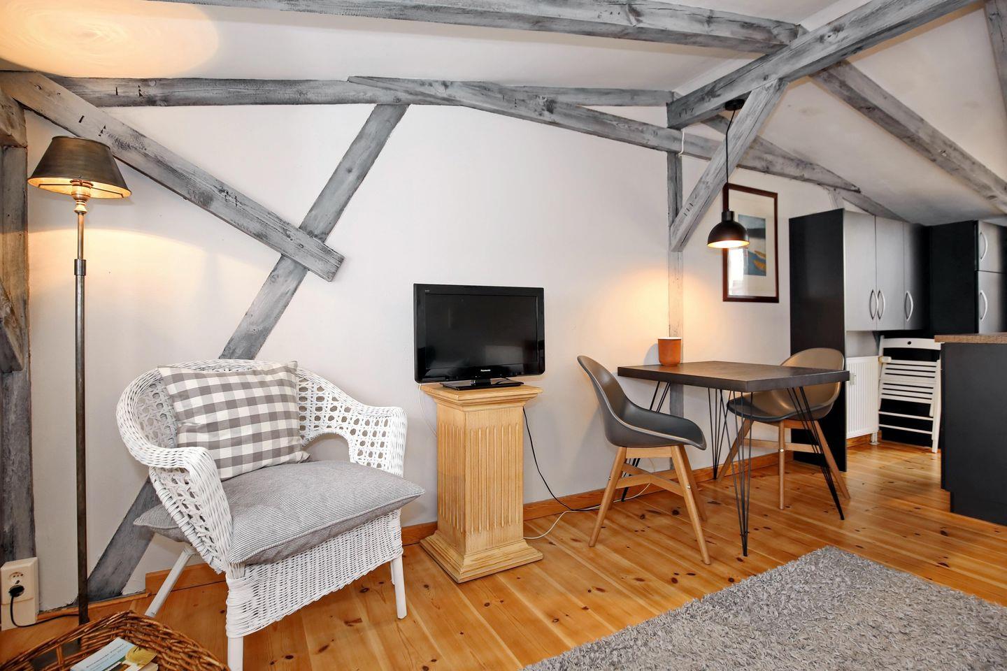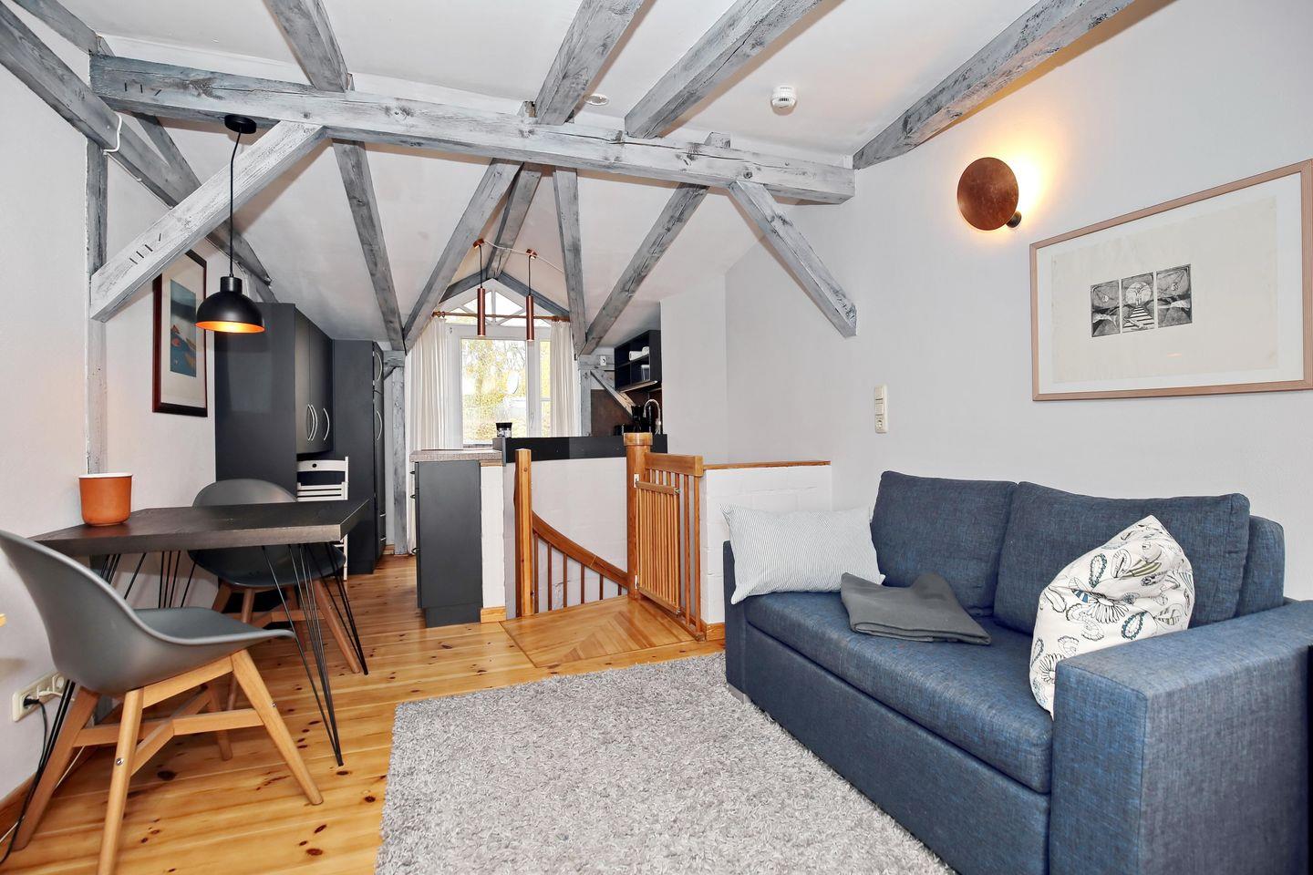 Der Wohnbereich ist mit einem Sofa, einem Flachbild-TV und einem kleinen Schreibtisch mit Stuhl eingerichtet. Die sichtbaren Dachbalken sorgen für rustikale Gemütlichkeit. Der angrenzende Essbereich bietet genügend Platz für eure gemeinsamen Mahlzeiten.