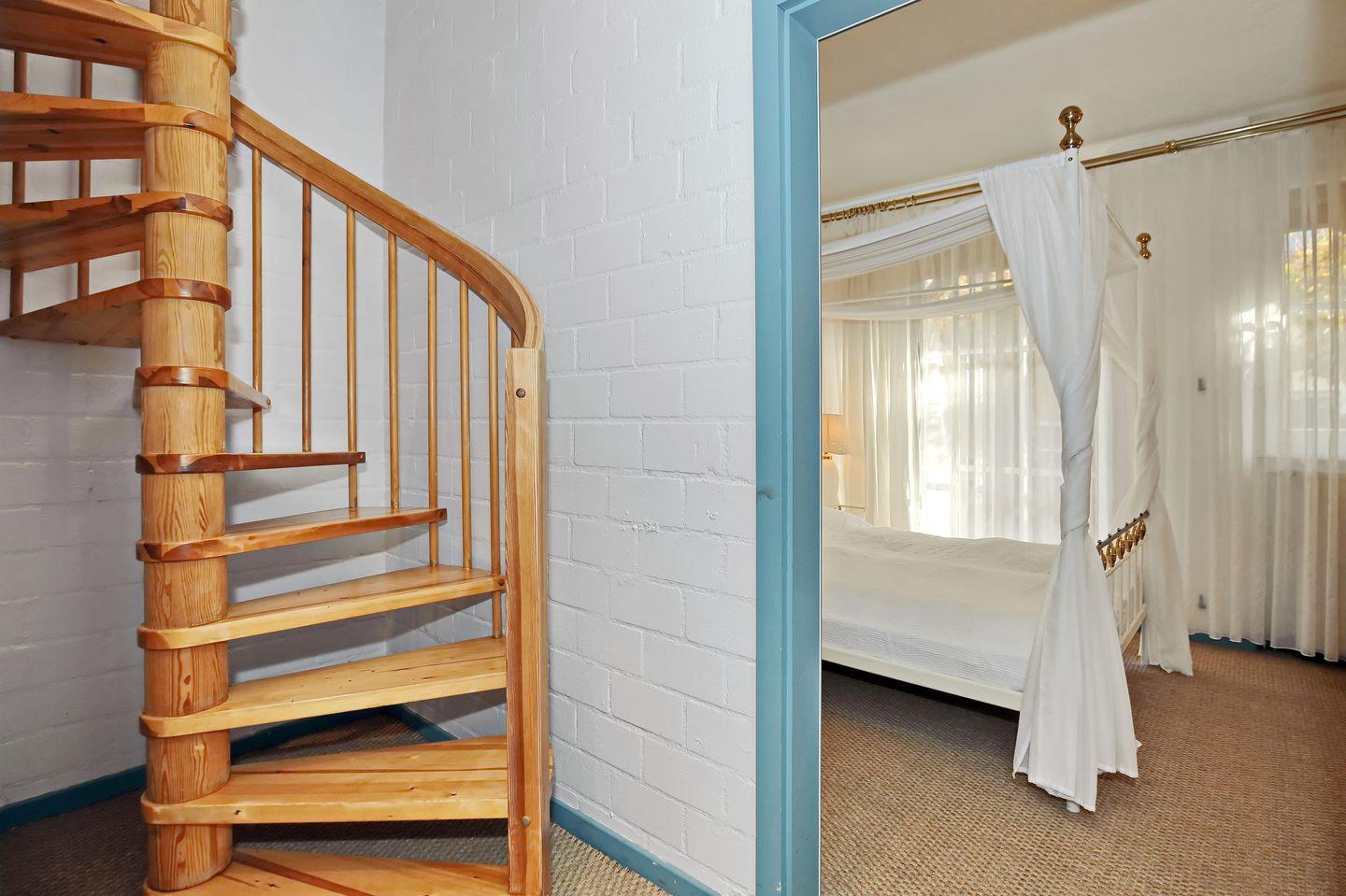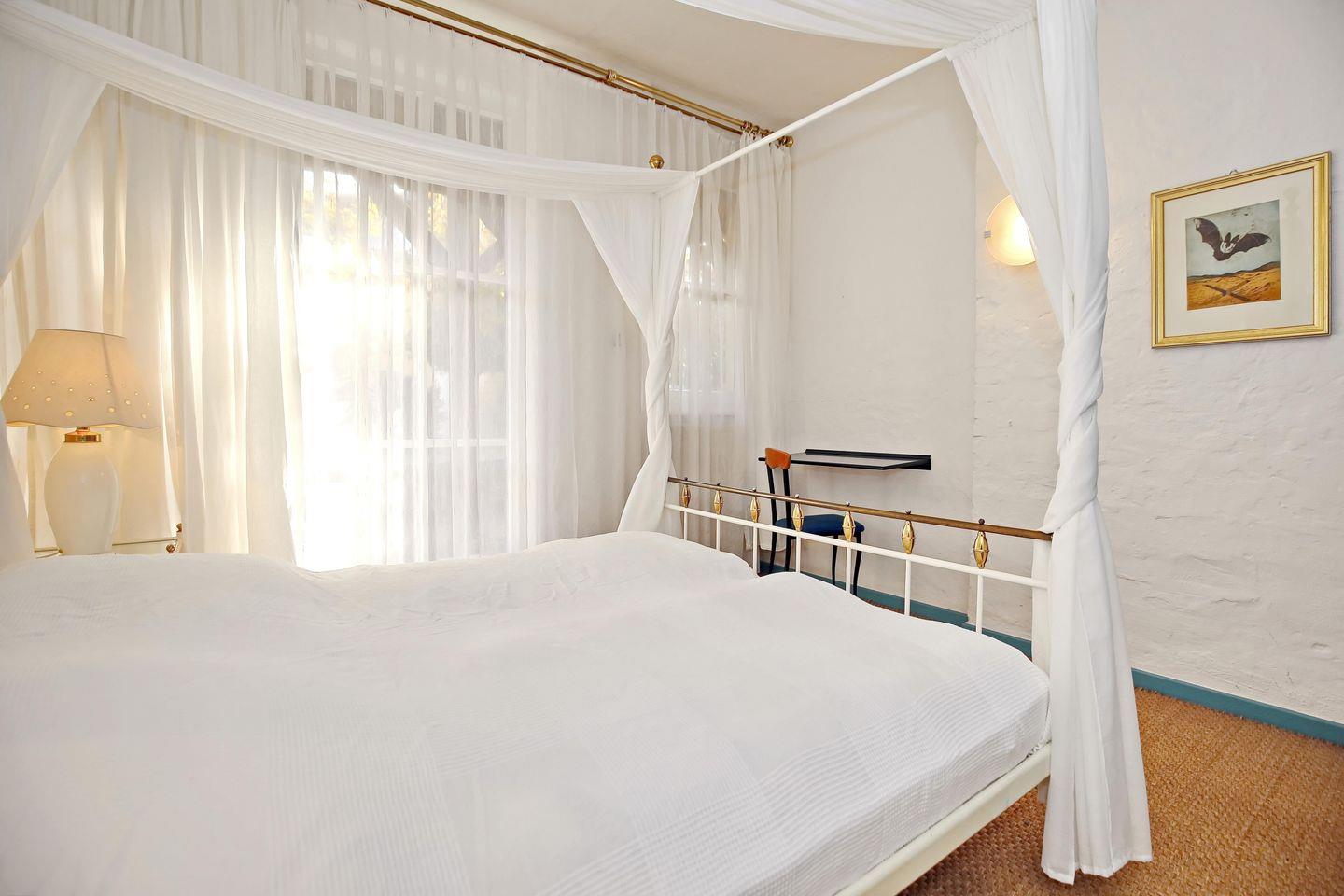 Im Schlafzimmer erwartet dich ein gemütliches Himmelbett (2 x 80 cm x 200 cm). Dein Urlaubsgepäck kannst du im Kleiderschrank verstauen, der sich im angrenzenden Flur befindet. Vorhänge dienen dir als Sichtschutz. Das Schlafsofa (120 cm x 200 cm) bietet im Wohnbereich einen Schlafplatz für eine Person.