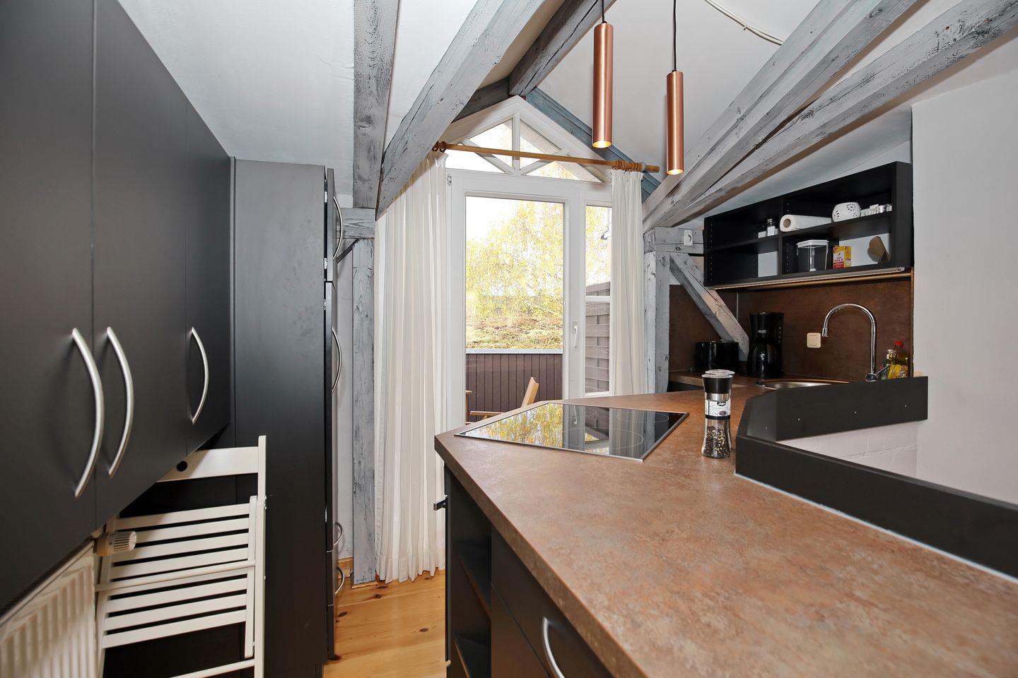 Die Küchenzeile der Ferienwohnung ist mit einem 4-Platten-Cerankochfeld, einem Kühlschrank mit Gefrierfach und einem Geschirrspüler ausgestattet. Ein Toaster und eine Kaffeemaschine komplettieren die Küche. Vom Küchenbereich aus hast du Zugang zum Balkon.