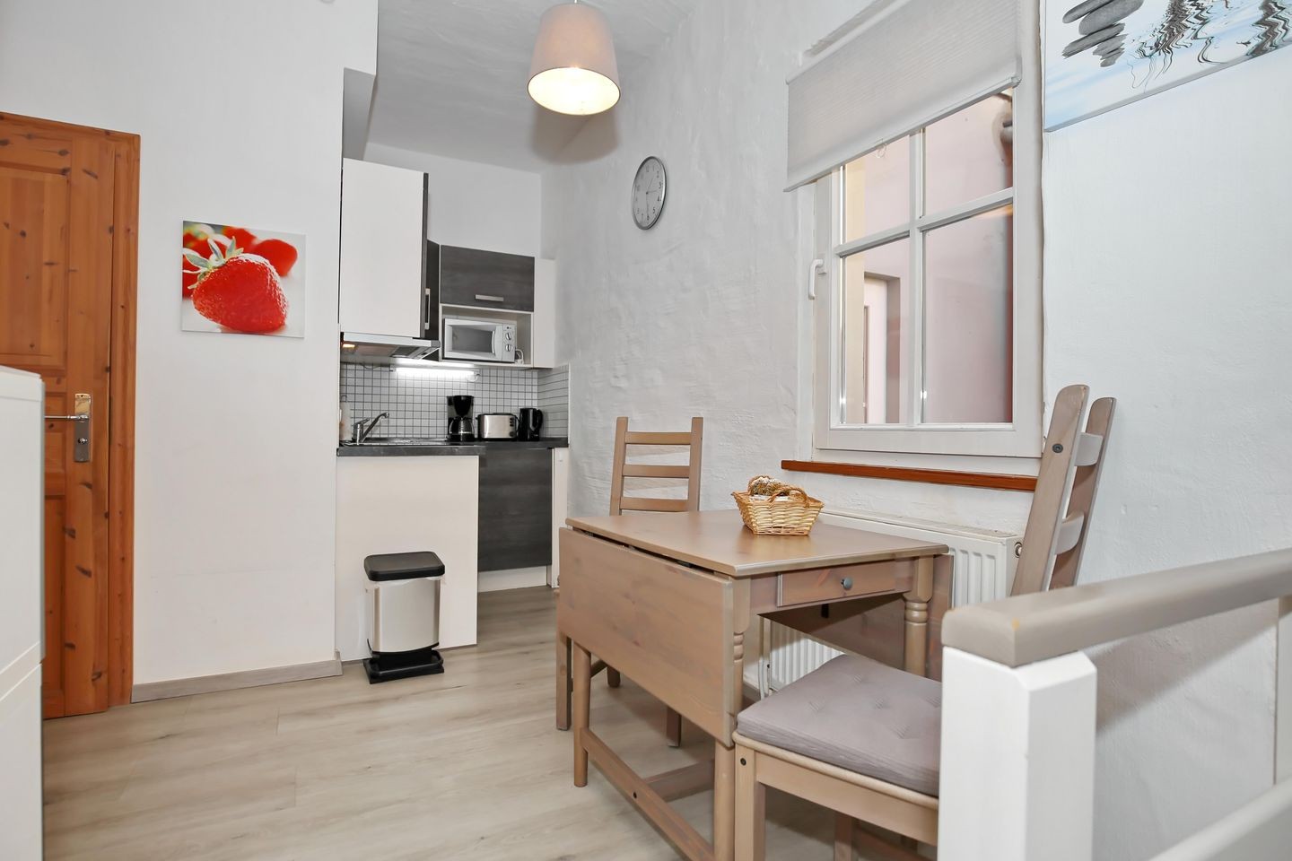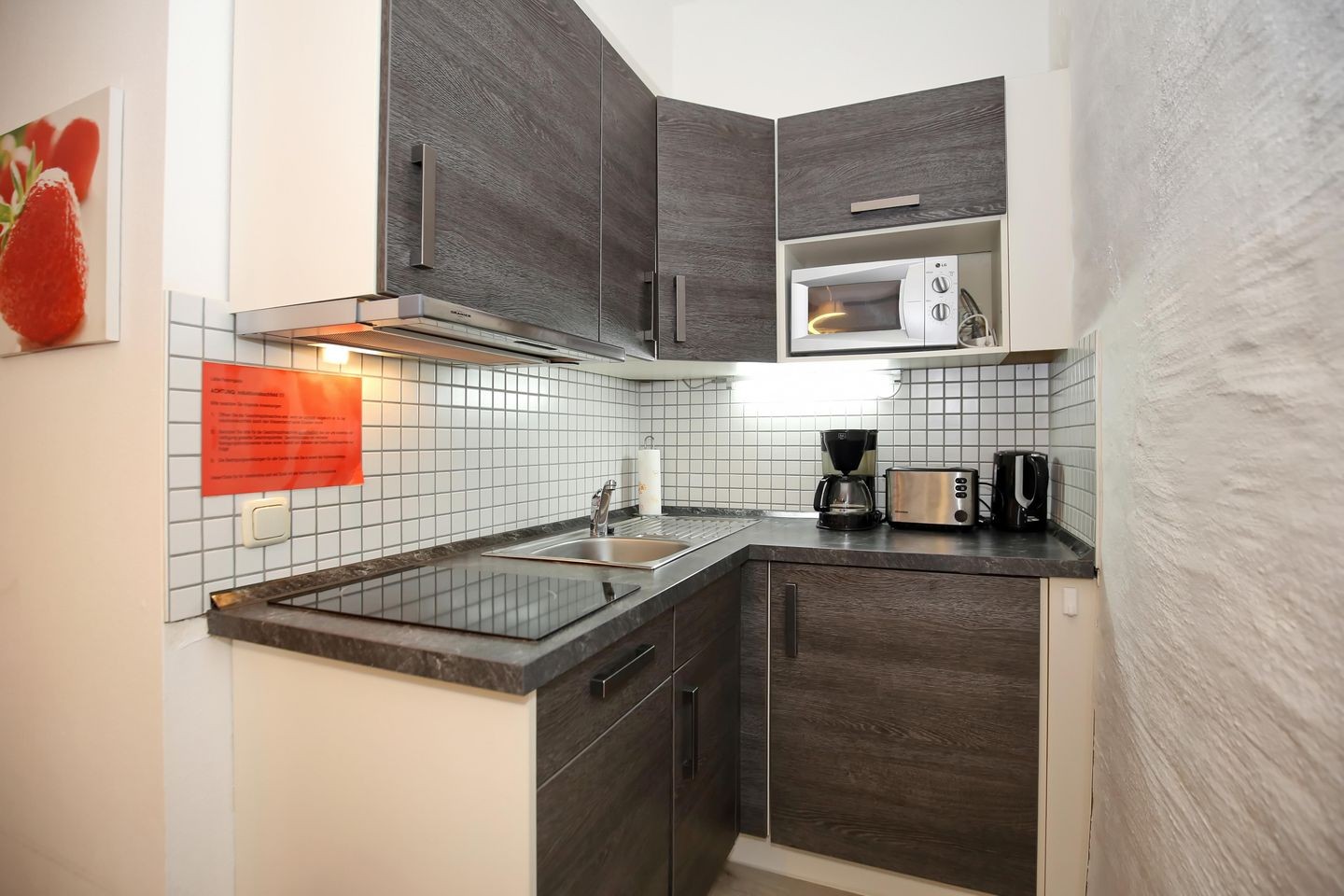 Die kleine moderne Küche der Ferienwohnung ist mit einem 2-Zonen-Induktionskochfeld, einem Kühlschrank mit Gefrierfach, einem Geschirrspüler, einer Mikrowelle sowie einer Kaffeemaschine und einem Toaster gut ausgestattet.