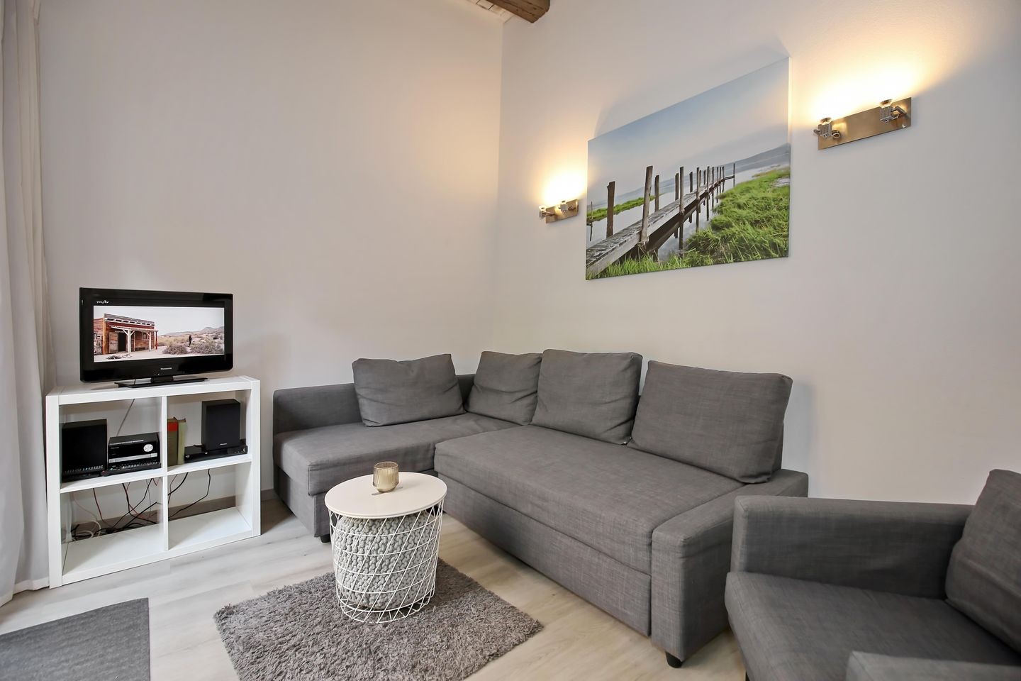 Im Schlafzimmer lädt ein bequemes Doppelbett (140 x 200 cm) zum erholsamen Schlaf ein. Ein Kleiderschrank bietet dir Stauraum für dein Gepäck. An den Fenstern angebrachte Plissees kannst du als Sichtschutz oder zum Verdunkeln nutzen. Die Schlafcouch im Wohnbereich wird mit nur wenigen Handgriffen zu einem Schlafplatz (160 x 200 cm) für 2 Personen. Als Sichtschutz dienen dir hier Vorhänge.
