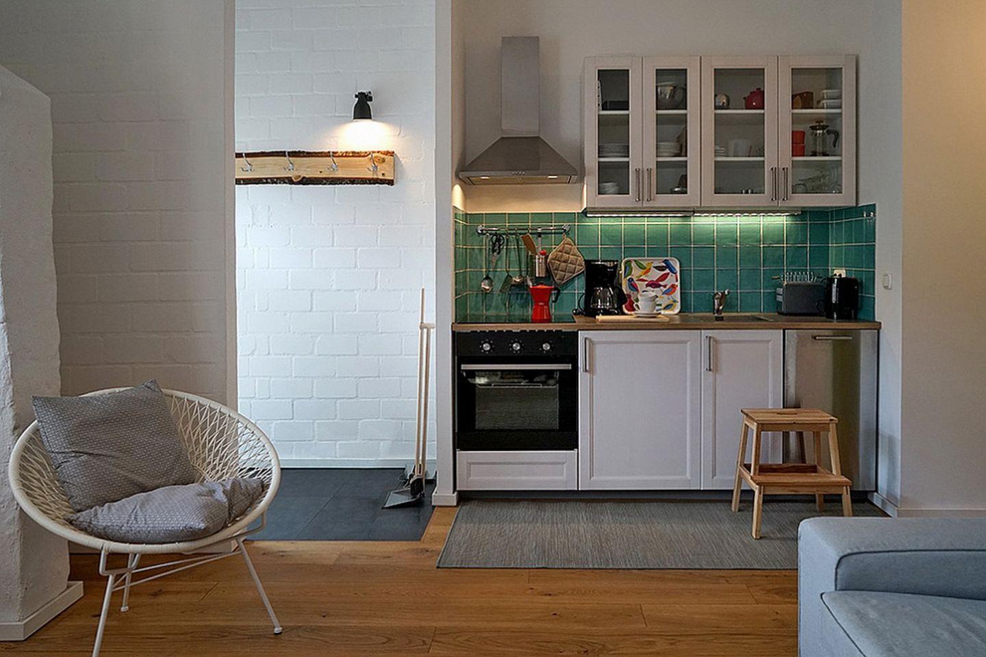 Der Wohnbereich mit integriertem Essbereich ist mit einem Sofa und Flachbild-TV ausgestattet. In der Küche stehen dir ein Herd mit einem 4-Platten-Cerankochfeld und Backofen, ein Kühlschrank mit Gefrierfach, ein Geschirrspüler, Kaffeemaschine, Wasserkocher und Toaster zur Verfügung.