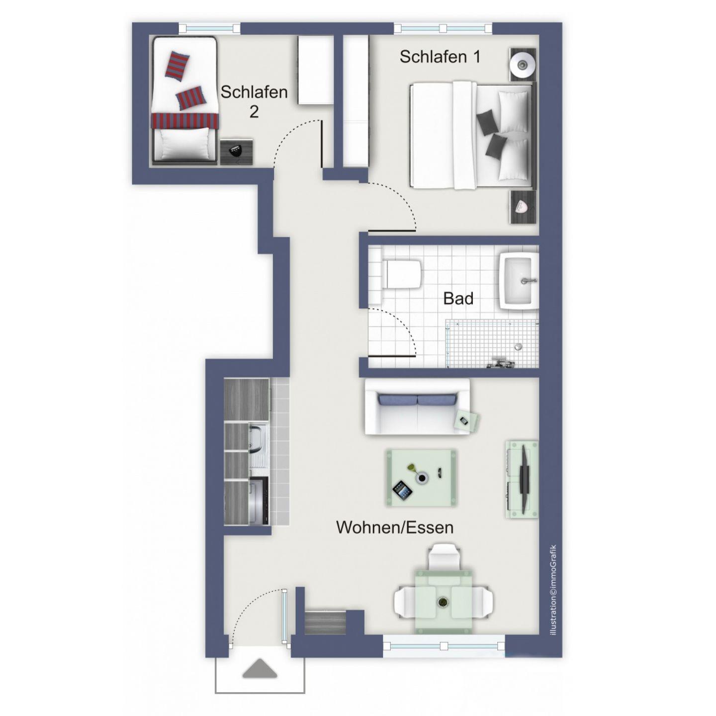 Die gut und modern ausgestattete 49 m² große Wohnung Nr. 2 liegt im Erdgeschoss. Sie verfügt über einen Wohn-/Essbereich, zwei Schlafzimmer und ein Duschbad.