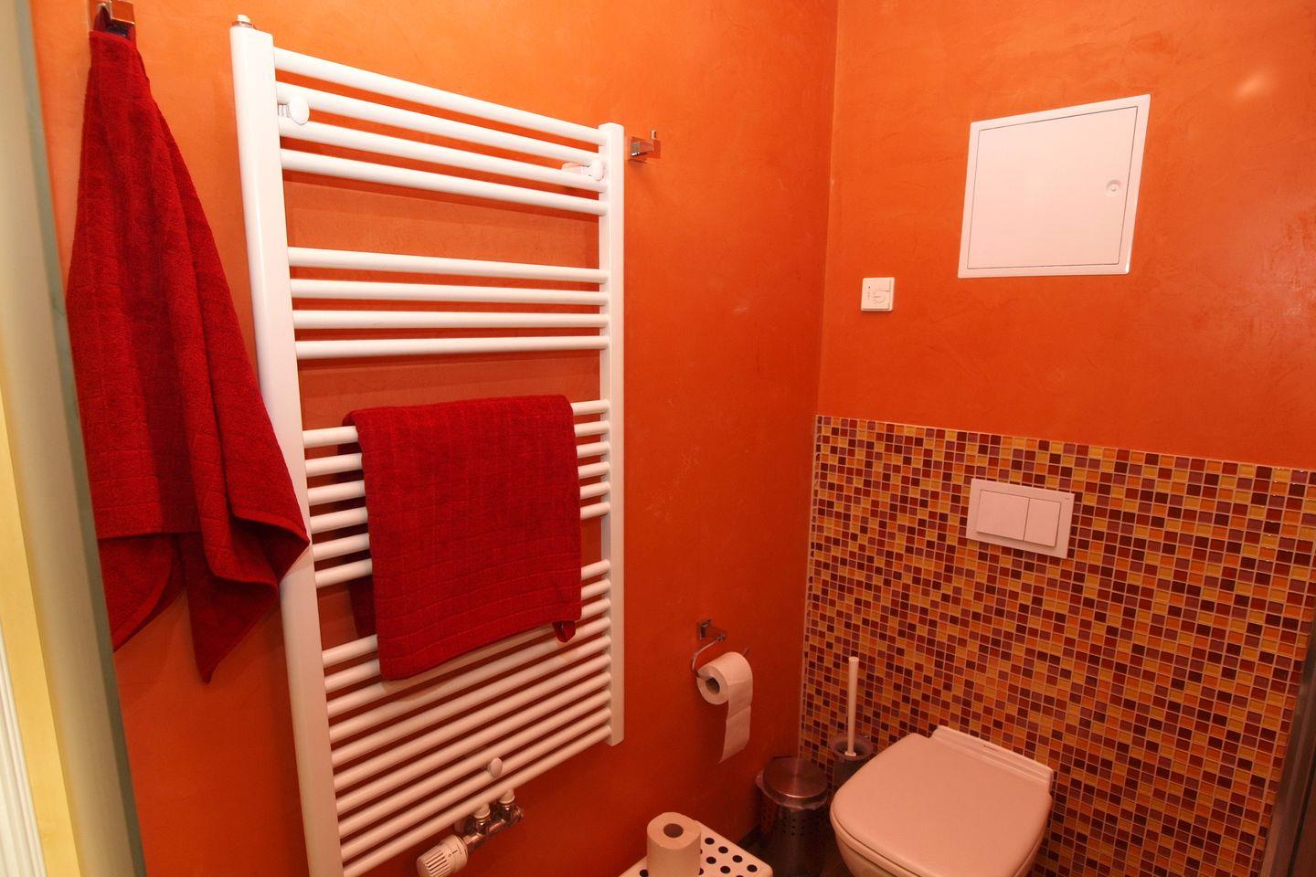 Das moderne Duschbad hat einen Spiegelschrank mit Beleuchtung und einen Handtuchheizkörper. Der Design-Belag verleiht der Wohnung einen stilvollen Charme.