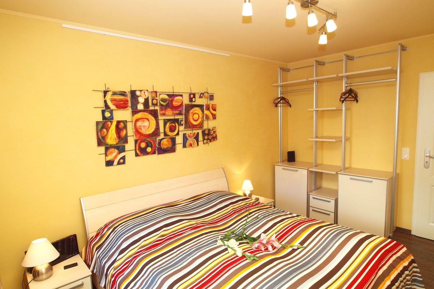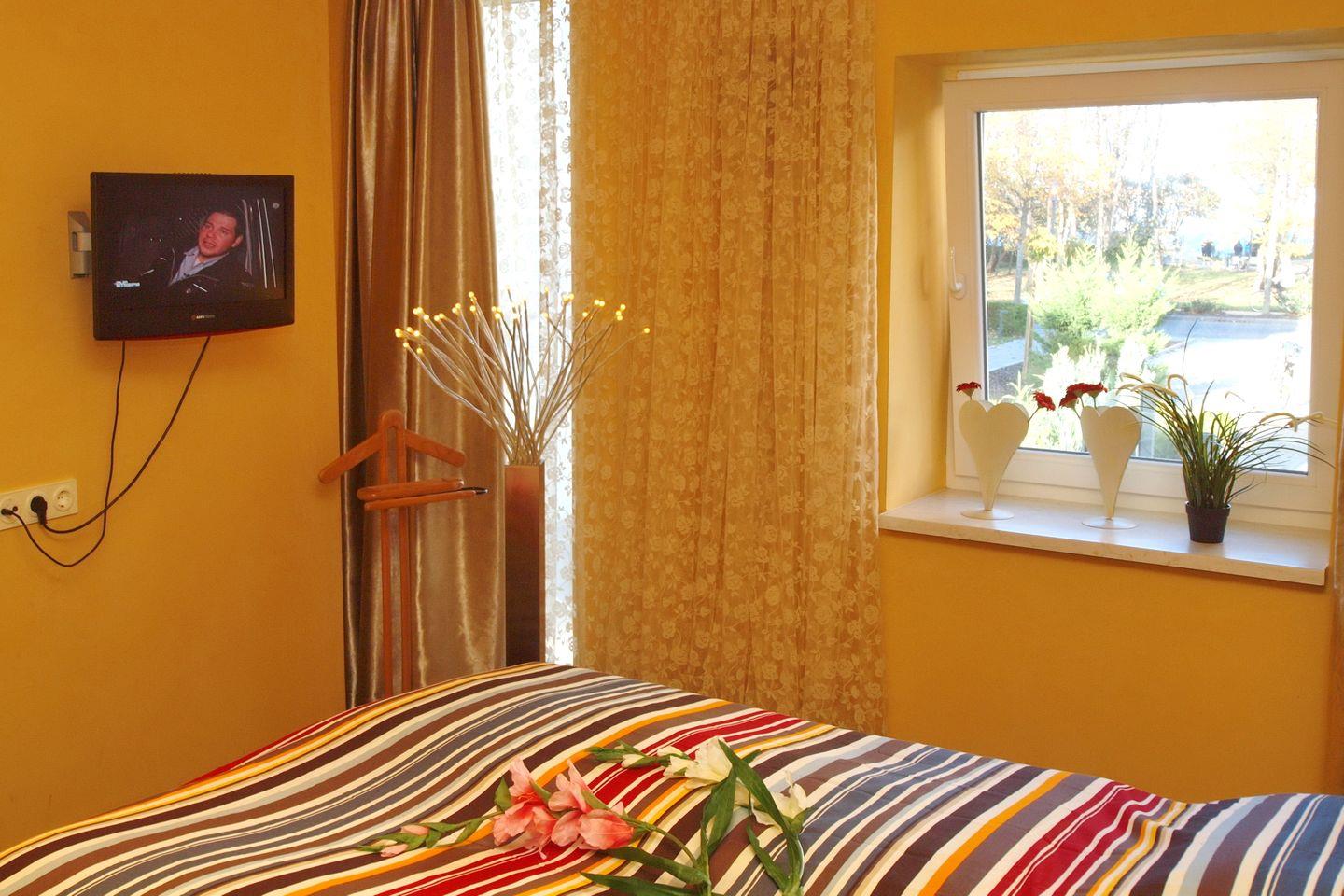 Das gemütliche Schlafzimmer hat ein bereits bezogenes Doppelbett (2 x 90 x 200 cm) und einen offenen Kleiderschrank. Dort findest du viel Stauraum. Es gibt auch einen Fernseher mit integriertem DVD-Player. Gardinen und Vorhänge sorgen für Privatsphäre.