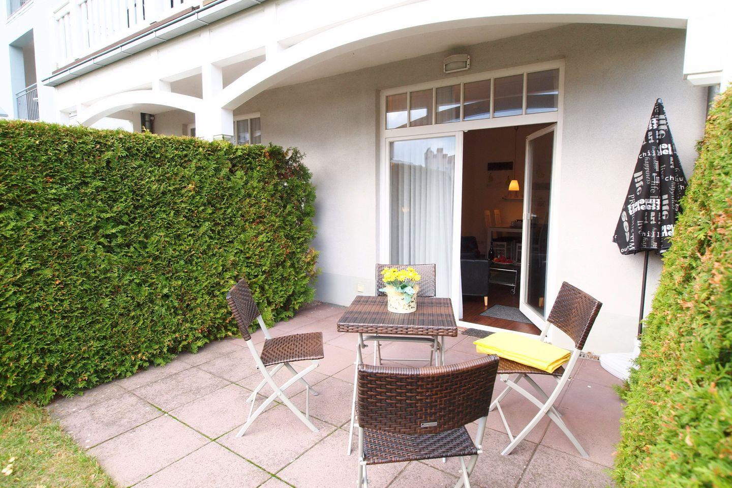 Die Ferienwohnung 012 im Haus Meeresblick ist eine 48 m² große 2-Zimmer-Wohnung für bis zu 4 Personen. Auf der Süd-Terrasse können Sie die Sonne ausgiebig genießen. Zum Haus gehören 2 Fahrstühle.