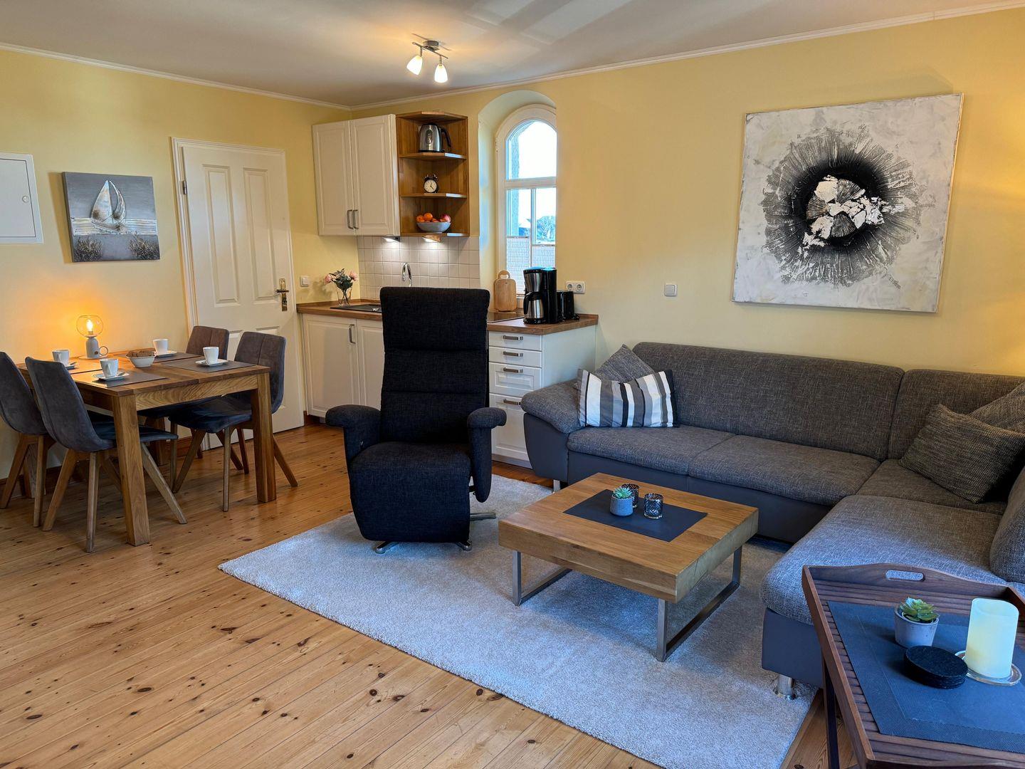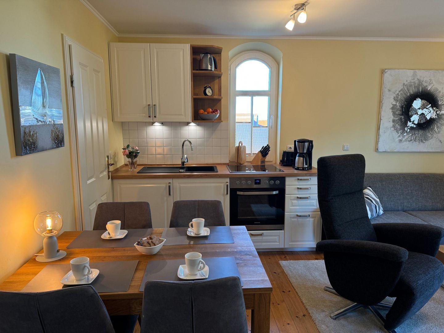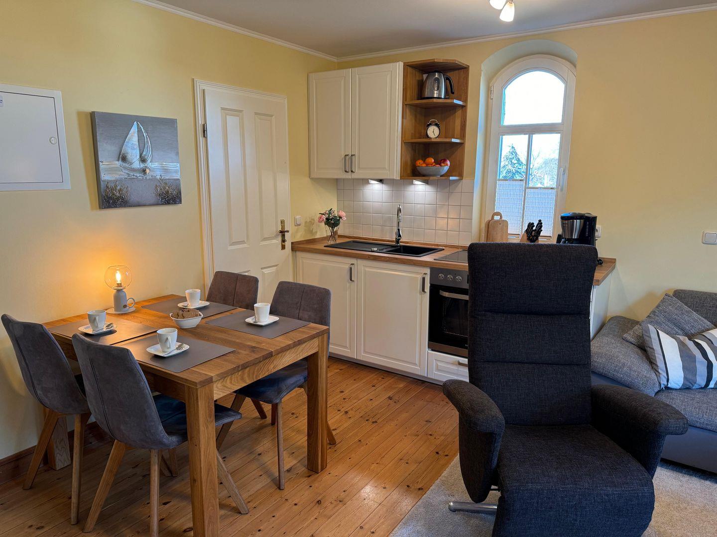 Die gut organisierte Küchenzeile verfügt über ein 4-Platten-Cerankochfeld, einen Backofen, einen Kühlschrank und natürlich auch über Kaffeemaschine, Wasserkocher und Toaster. Am angrenzenden Esstisch können bis zu 4 Personen Platz nehmen.
