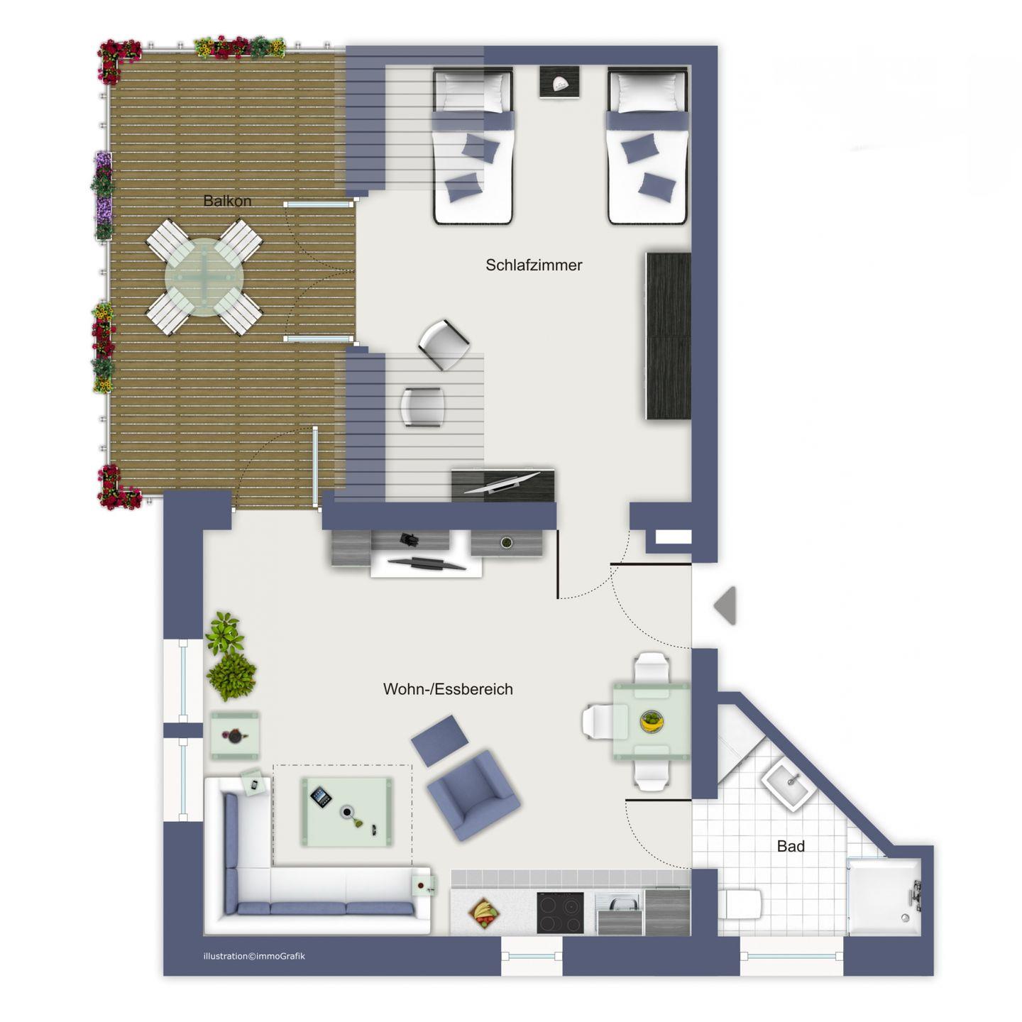 In gemütlicher Atmosphäre kannst du hier im 2. Obergeschoss auf etwa 40 Quadratmetern entspannen. Es erwarten dich ein einladender Wohnbereich mit Küchenzeile und Essecke sowie ein separates Schlafzimmer und ein Badezimmer. Auf dem großzügigen Balkon Richtung Norden kannst du den Blick zum Stadtwald genießen. Zum feinen Ostseestrand sind es ca. 800 Meter.