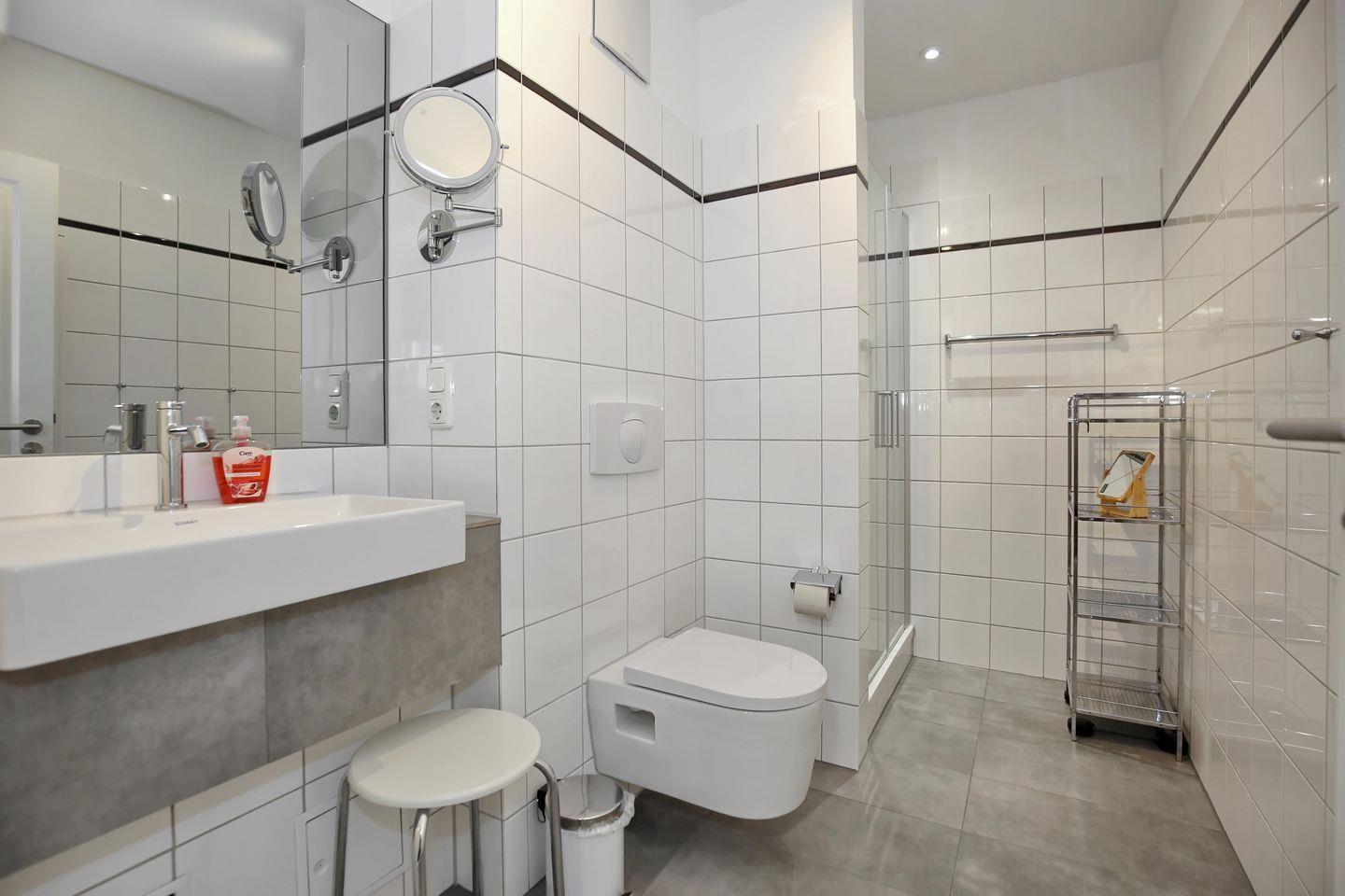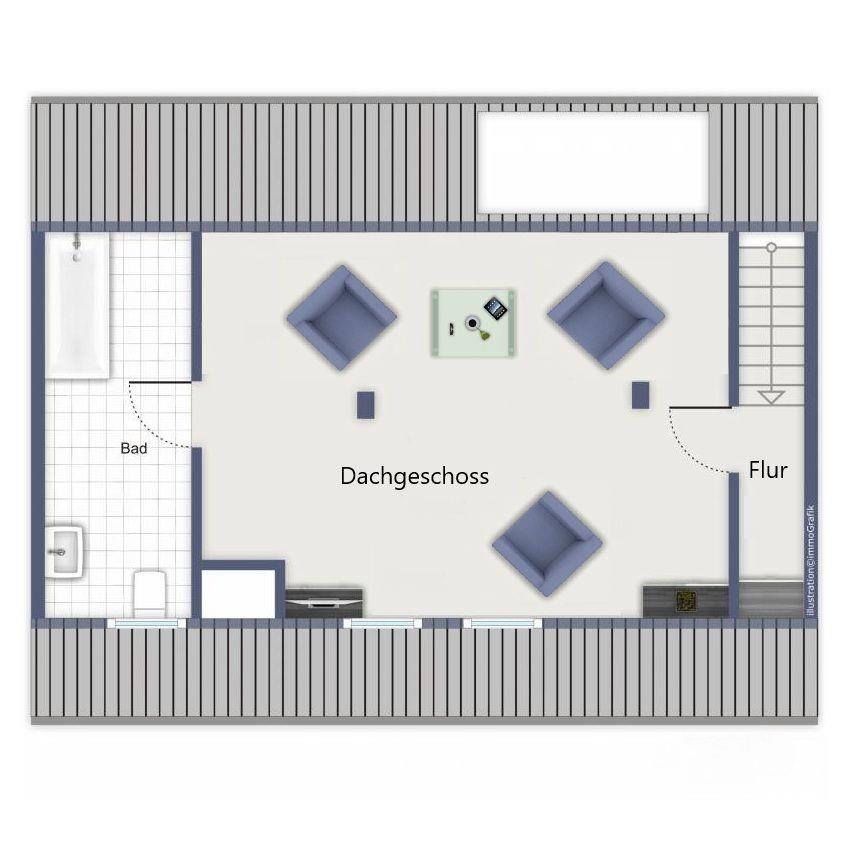 Über die Treppe gelangst du ins ausgebaute Dachgeschoss. Hier steht dir ein zweiter Rückzugsort mit Lesesesseln und einem zweiten Flachbild-TV zur Verfügung. Vom Dachfenster hast du einen weiten Blick über die Dächer von Kühlungsborn West und einen Teilseeblick auf die Ostsee. Im Dachgeschoss befindet sich ein zweites Duschbad/ WC mit einer großzügigen Badewanne.