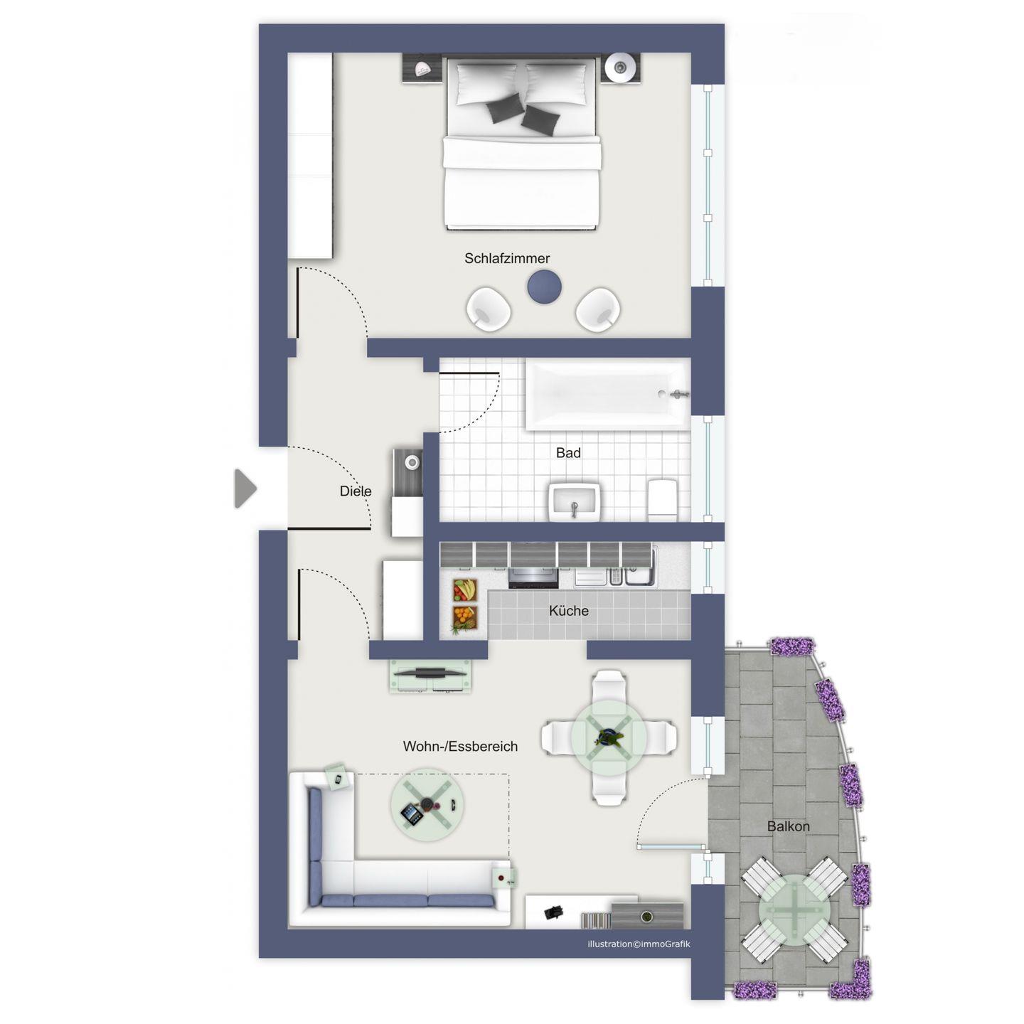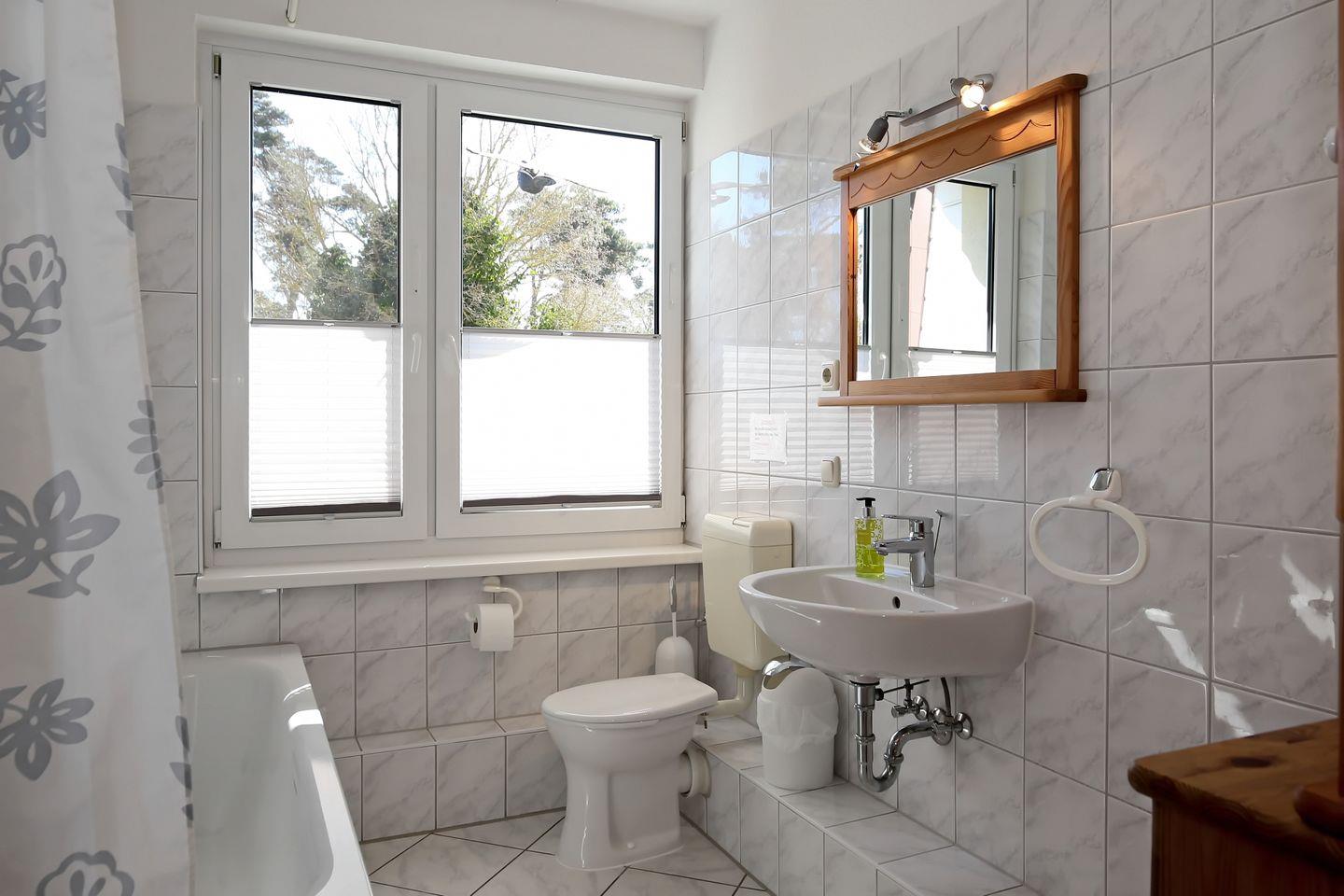Im hellen Tageslichtbad mit WC kannst du zwischen Baden und Duschen wählen. Eine Badewanne mit Duschvorrichtung, ein beleuchteter Spiegel und ein Handtuchhalter gehören zur Badeinrichtung. Plissees sind als Sichtschutz am Fenster abgebracht. Das Bad und der Küchenbereich sind gefliest. Im Flur, im Schlafzimmer und im Wohnbereich ist Vinyl verlegt.