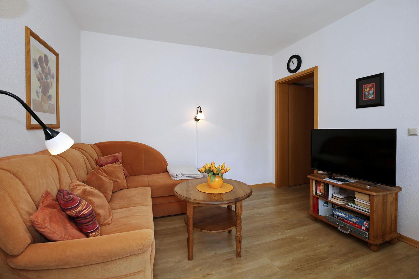 Der gemütliche Wohnbereich der Ferienwohnung ist mit einer bequemen Eck-Couch und einem großem Flachbild-TV sowie ein Radio eingerichtet. Für gesellige Abende sind Bücher und Gesellschaftsspiele vorhanden. WLAN steht dir kostenlos zur Verfügung. Der eingegliederte Essbereich bietet viel Platz für gemeinsame Mahlzeiten. Von hier aus gelangst du auf den Balkon.