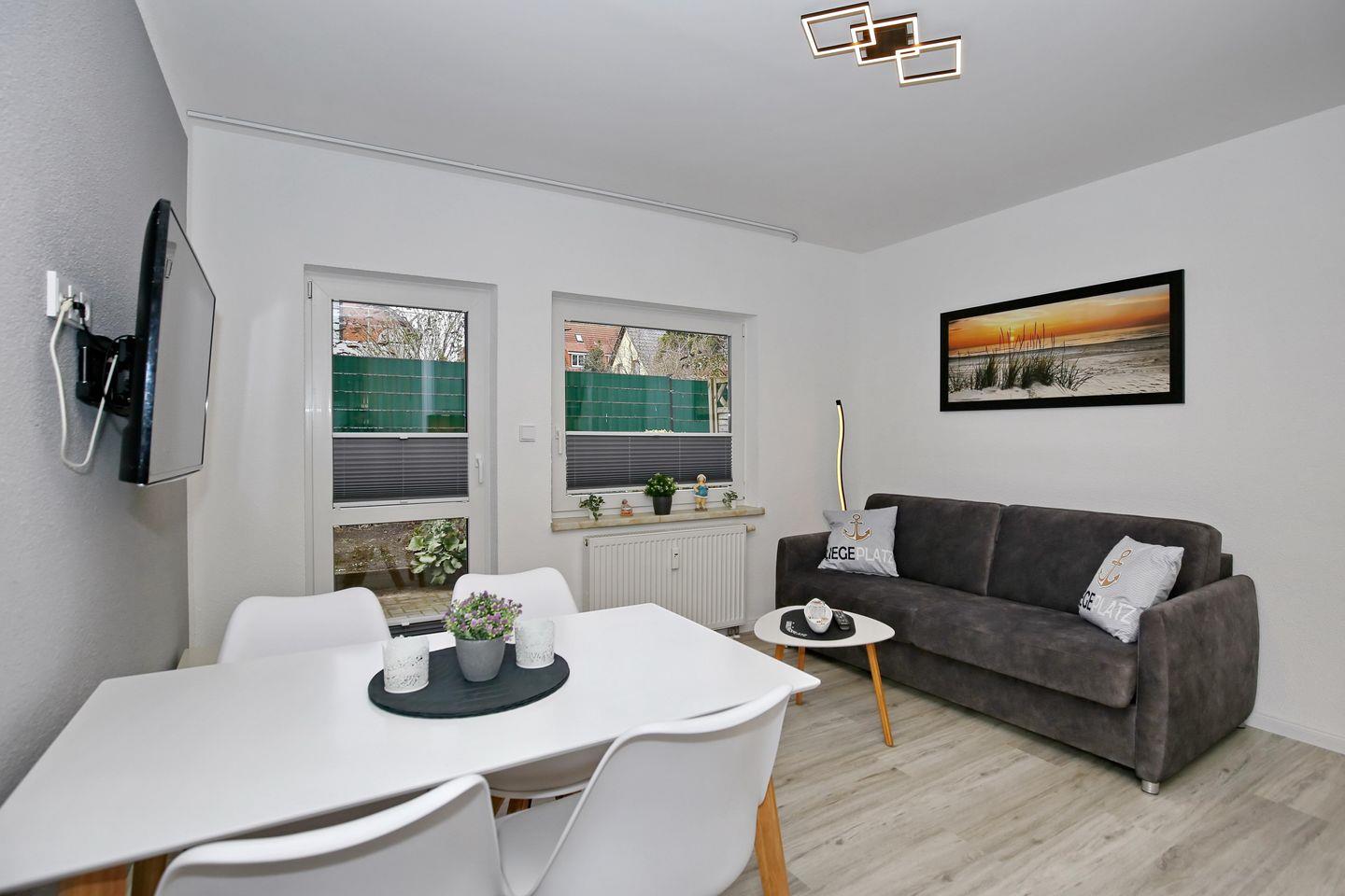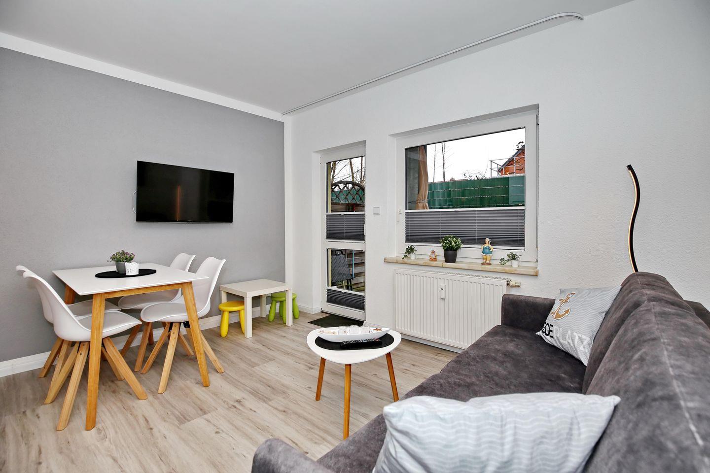 Die im Jahr 2023 komplett renovierte und modernisierte Ferienwohnung bietet dir 34 Quadratmeter Wohnfläche im Erdgeschoss. Dir erwarten ein offener Wohnbereich mit Küchenzeile und Essbereich, eine angrenzende Terrasse, ein separates Schlafzimmer und ein Duschbad. Zum Strand sind es nur etwa 600 Meter.