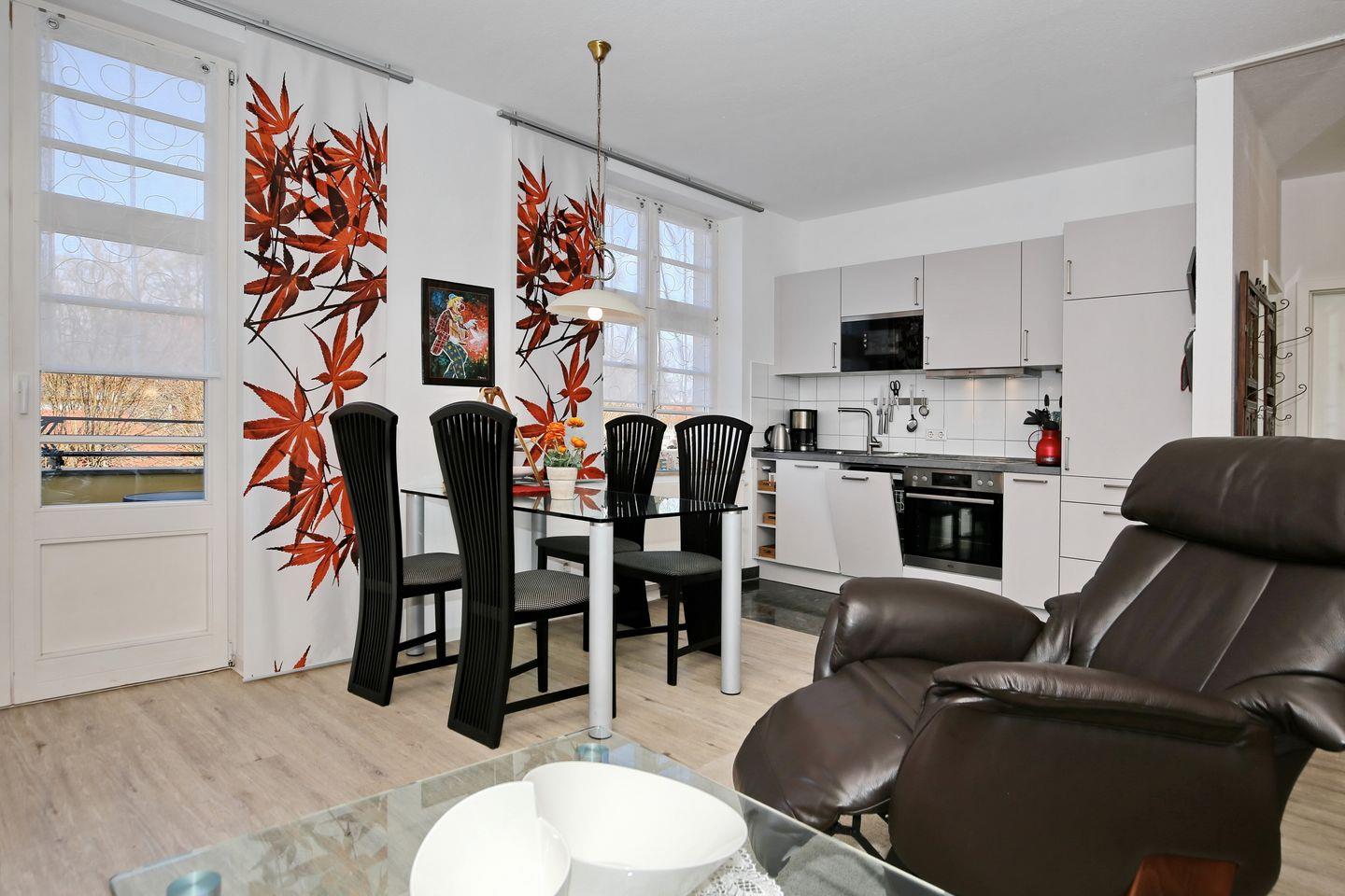 Die hell und freundlich eingerichtete 2-Zimmer-Wohnung Nr. 12 ist für bis zu 4 Personen. Die Wohnung ist auch über einen Fahrstuhl erreichbar. Der Balkon befindet sich auf der Ostseite des Hauses.