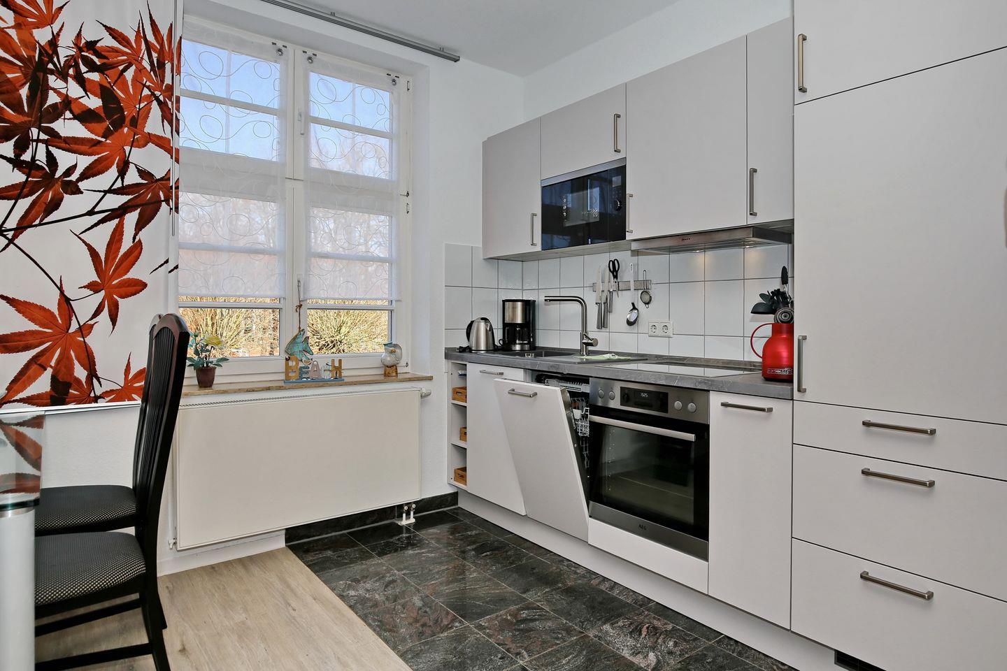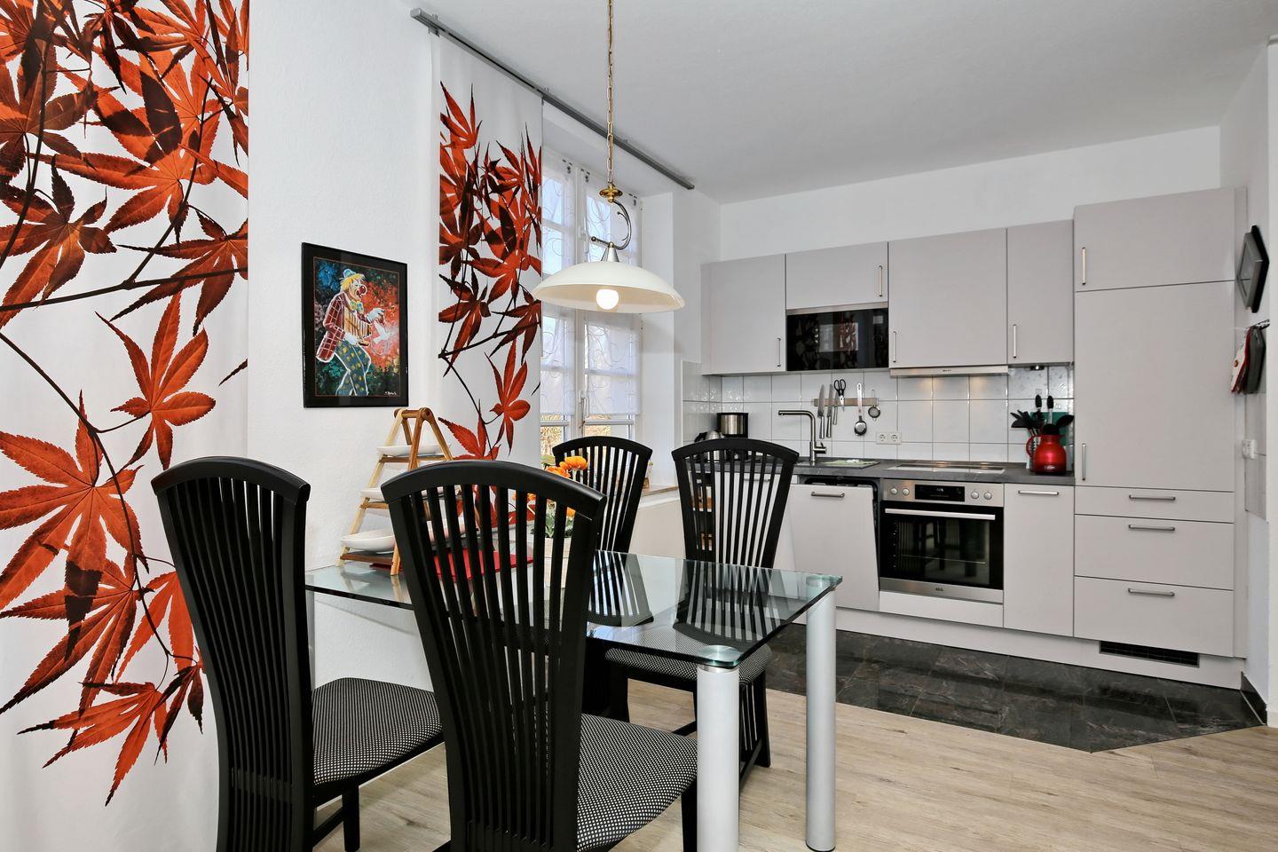 Die moderne Einbauküche ist im Wohnzimmer integriert und verfügt über 4 Cerankochfelder, einen Geschirrspüler, eine Mikrowelle, einen Wasserkocher, einen Toaster sowie eine Kaffeemaschine.