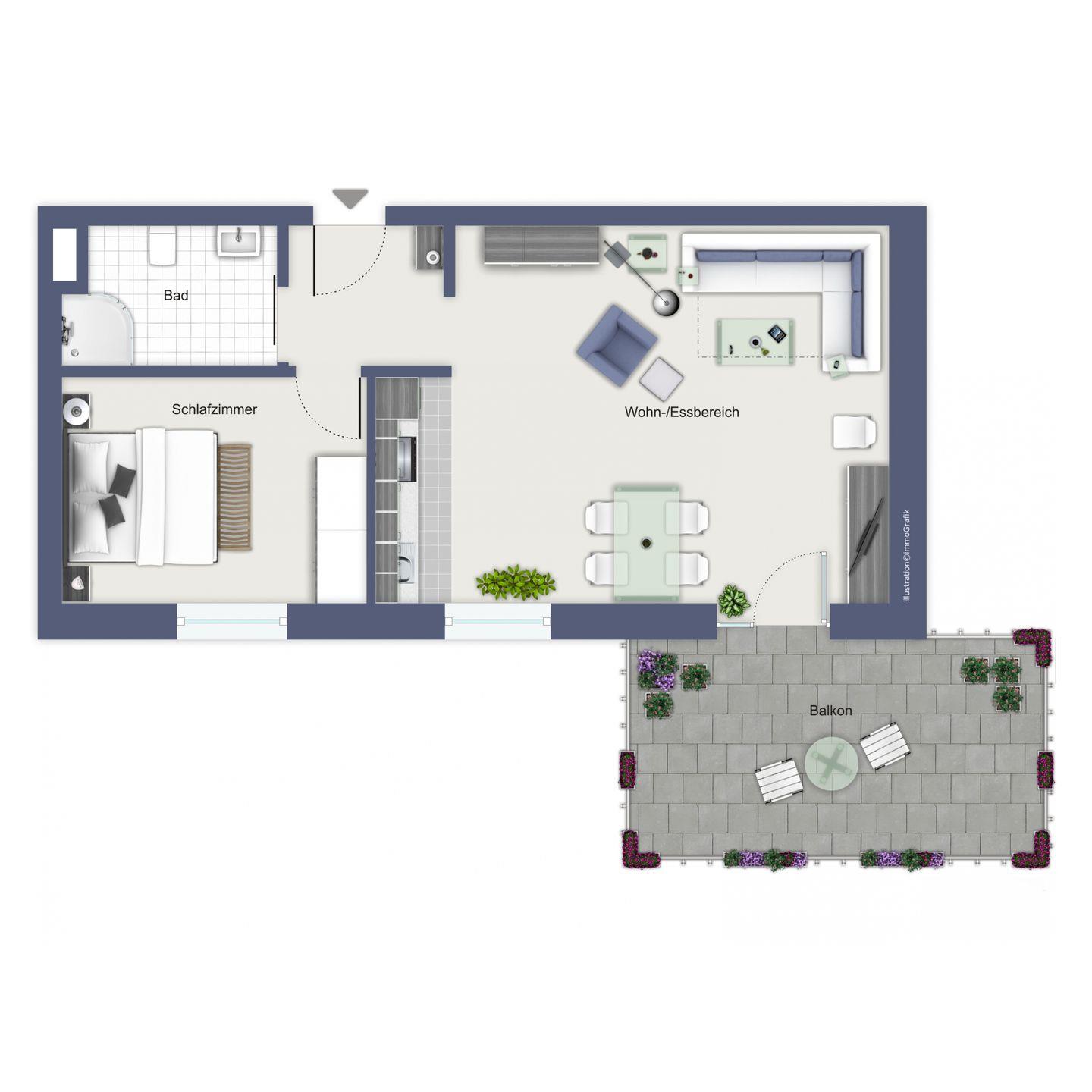 Im Schlafzimmer stehen ein Boxspringbett, ein Flachbild-TV und ein Kleiderschrank für dich bereit. Die Wohnung ist mit Designbelag ausgelegt, das Bad ist gefliest.