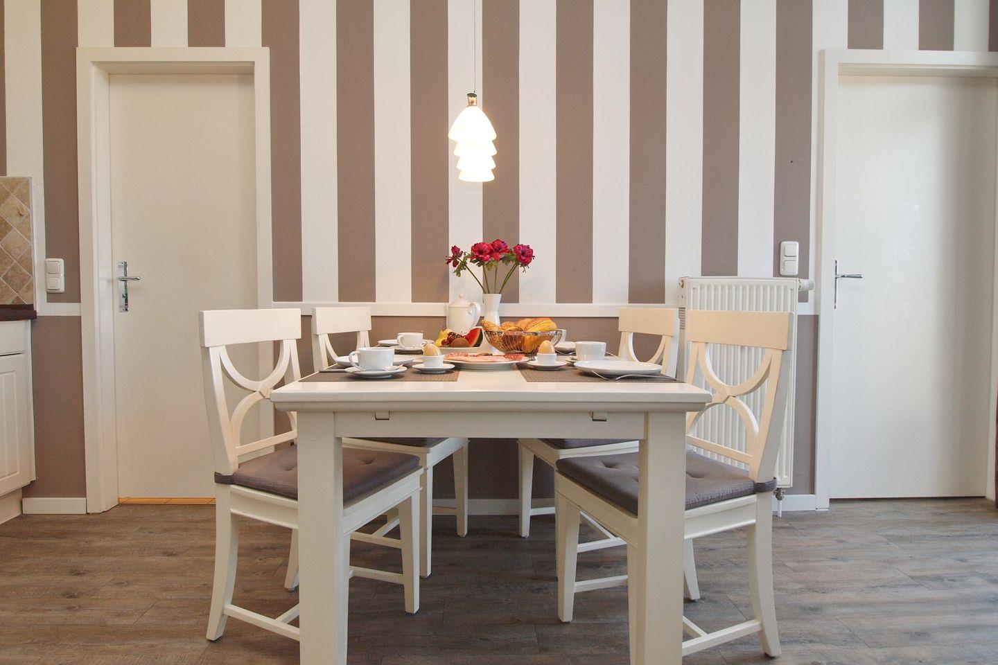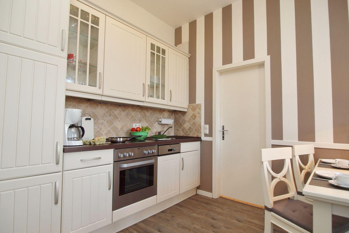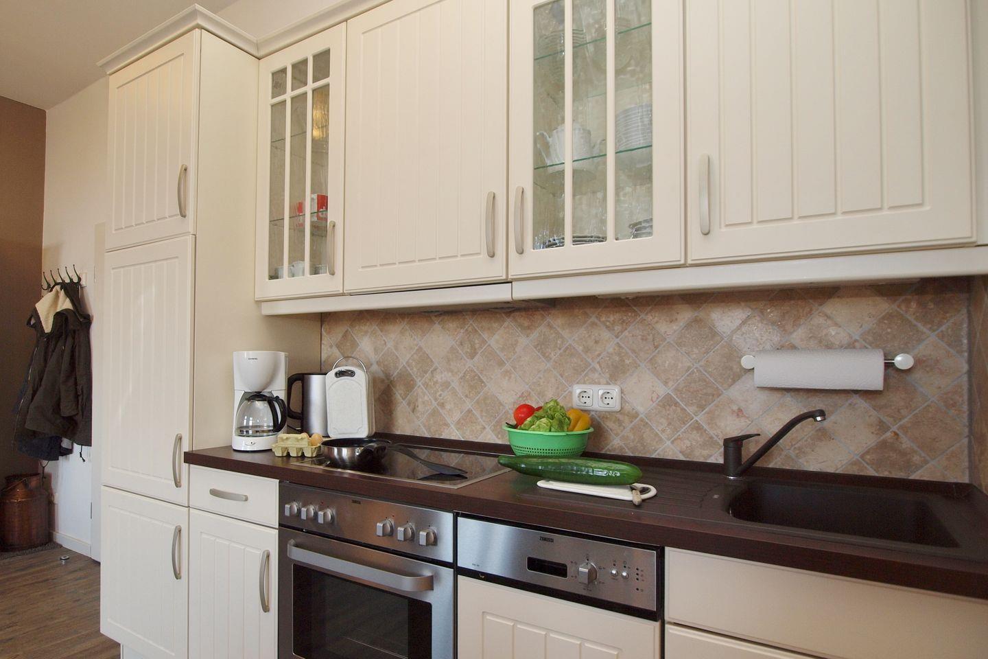 Die Küche ist mit 4er Cerankochfeld, Kühlschrank mit Gefrierfach, Backofen, Geschirrspüler, Kaffeemaschine, Toaster und Wasserkocher voll ausgestattet. Der Essplatz ist für 4 Personen ausgerichtet.