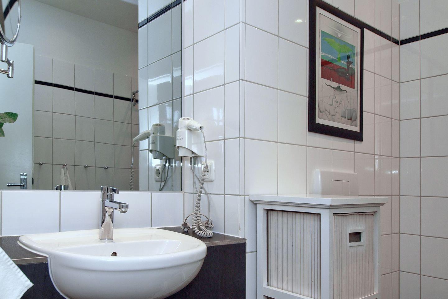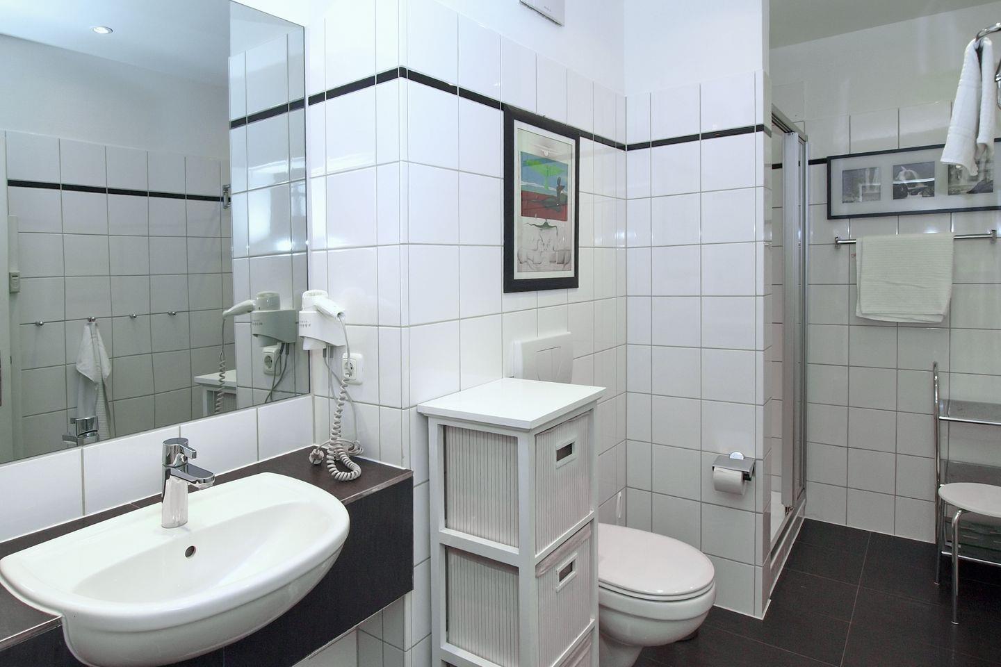 Das moderne Duschbad ist gefliest und verfügt über eine Dusche mit niedrigem Einstieg, einem WC und einem Föhn. Ein eingebautes Radio sorgt für Unterhaltung. Der kleine Hocker hilft den jüngeren Gästen beim Erreichen des Waschbeckens. In der restlichen Ferienwohnung wurde hochwertiger PVC-Belag verlegt.