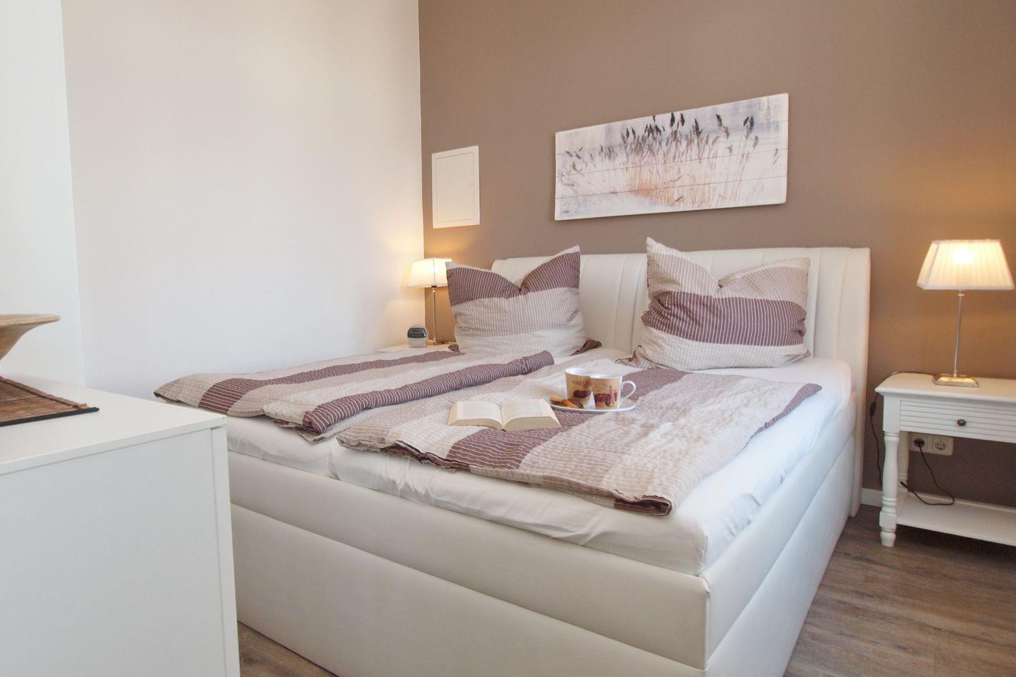 Das behaglich eingerichtete Schlafzimmer sorgt mit dem Doppelbett (180 x 200 cm einteilige Matratze), dem Kleiderschrank, einer Kommode und dem LCD-Fernseher für Entspannung. Gardinen dienen als Verdunkelungsmöglichkeit.