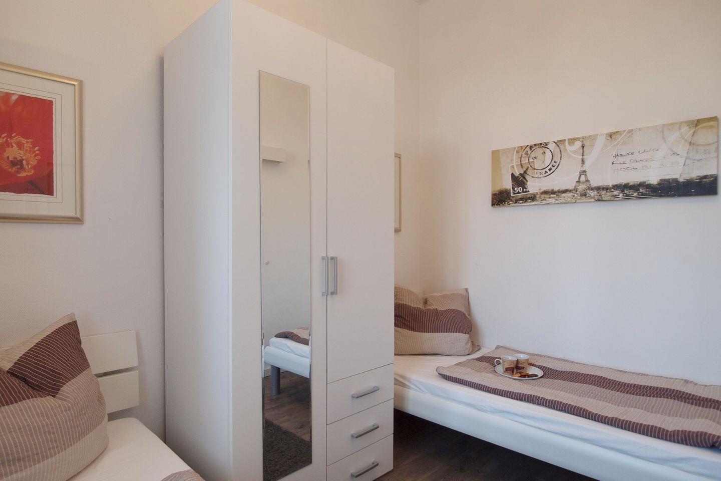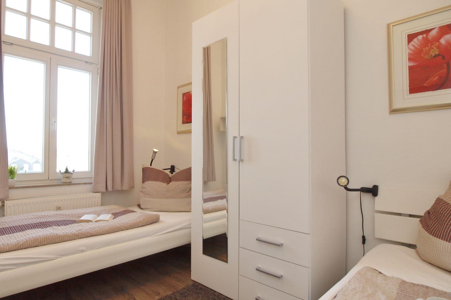 Das zweite Schlafzimmer ist mit zwei Einzelbetten (90 x 200 cm), einem Ventilator und einem Kleiderschrank ausgestattet. Auch hier dienen Gardinen als Verdunkelungsmöglichkeit.