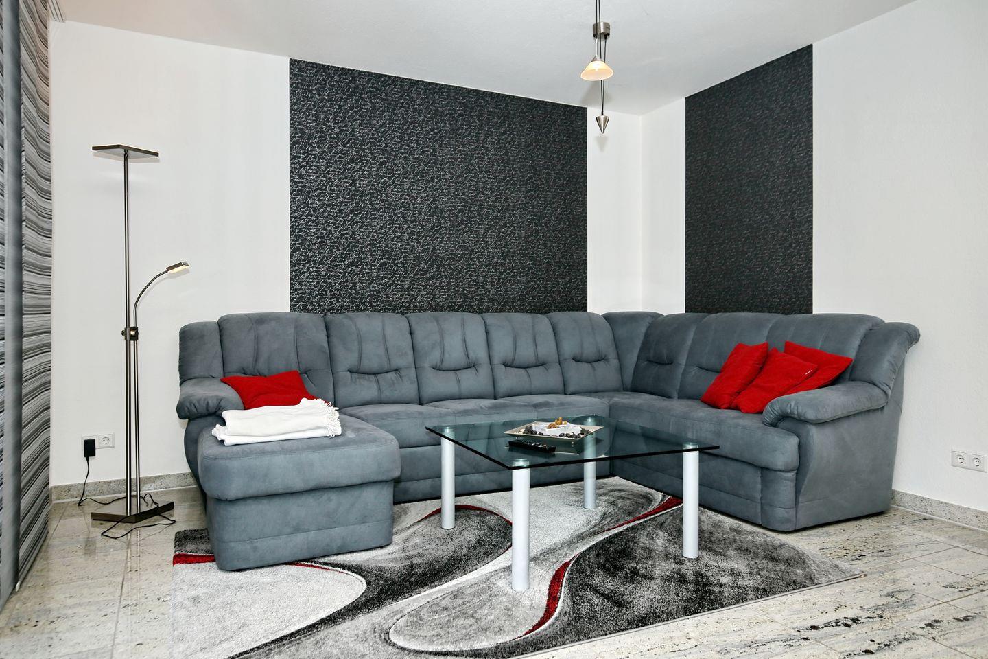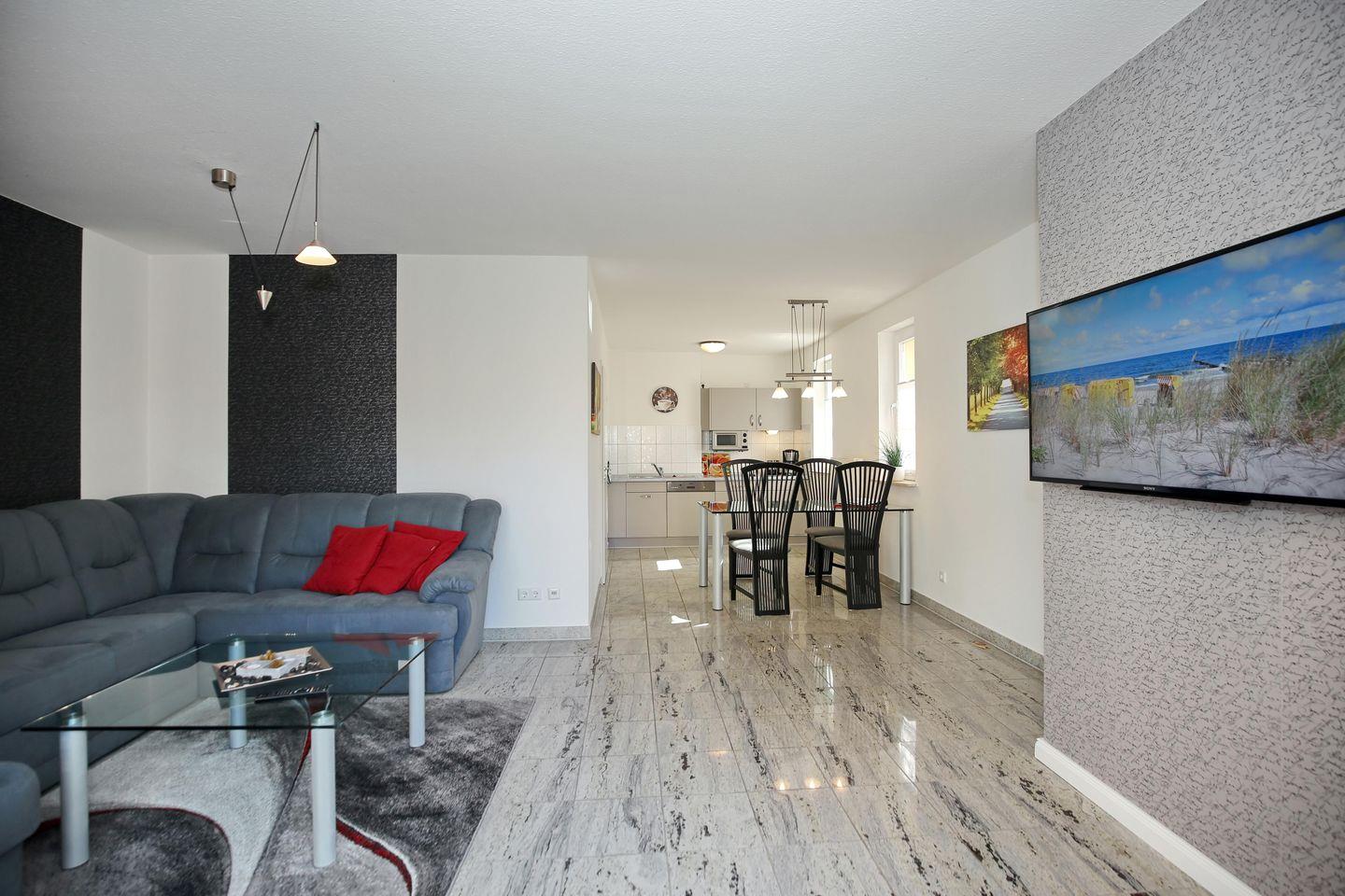 Entspanne auf der großzügigen Sofalandschaft im Wohnbereich. Für Unterhaltung sorgen hier der Flachbild-TV, die Stereo-Anlage und das WLAN (ohne Gewähr). Die Terrasse befindet sich auf der Süd-West-Seite des Hauses und ist vom Wohnzimmer aus zugänglich.