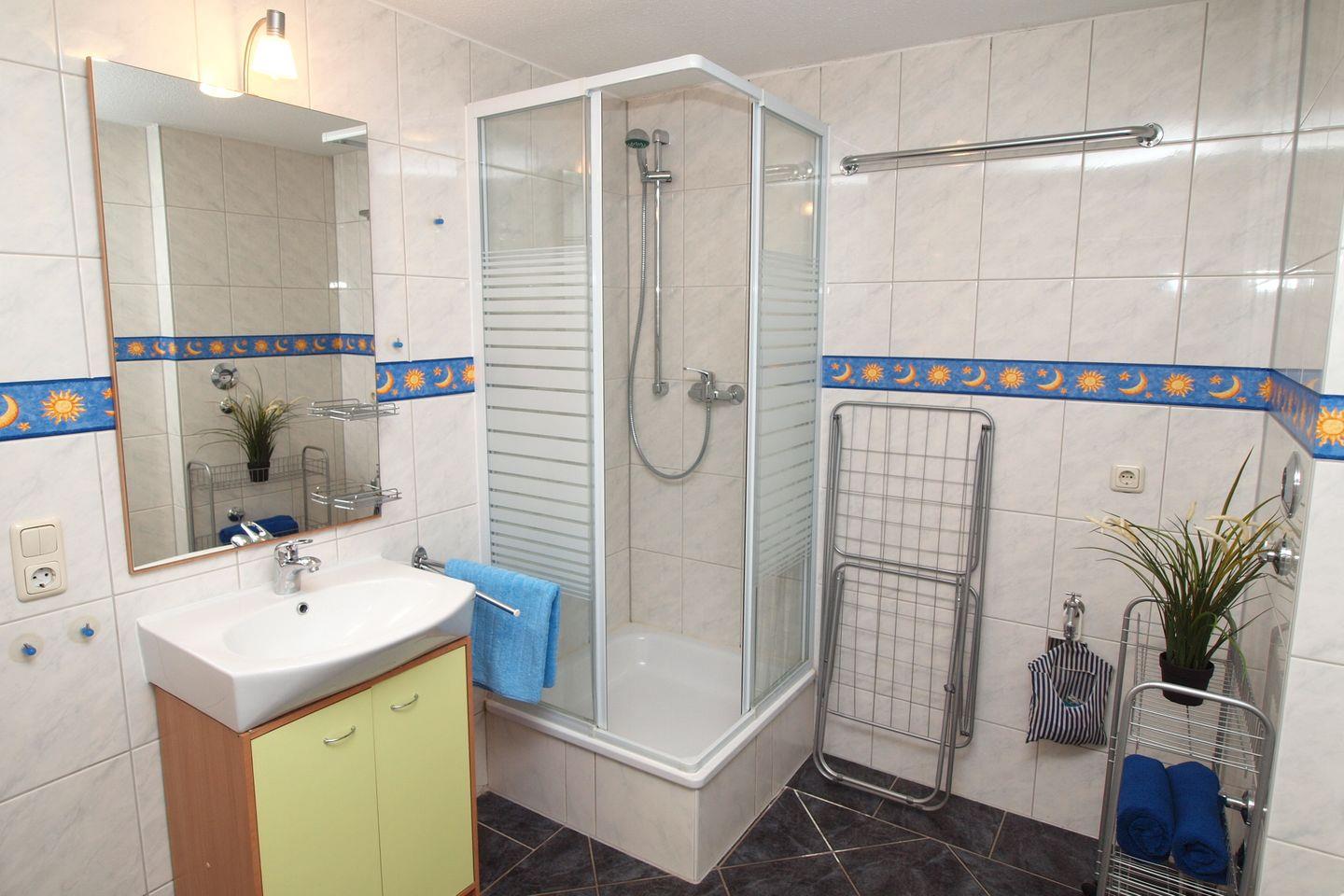 Das geräumige Tageslichtbad der Ferienwohnung ist für dich mit einer Dusche und einem WC ausgestattet. Für deine Waschutensilien bieten der Waschtisch und ein Regal viele Ablagemöglichkeiten. Ein Spiegel mit Beleuchtung, ein Föhn und ein Wäscheständer mit Wäscheklammern vervollständigen die Badeinrichtung. Das Bad ist gefliest. Die Wohn- und Schlafbereiche sind mit einem modernen Design-Belag ausgestattet. In dieser Nichtraucher-Wohnung sind Haustiere nicht erlaubt.