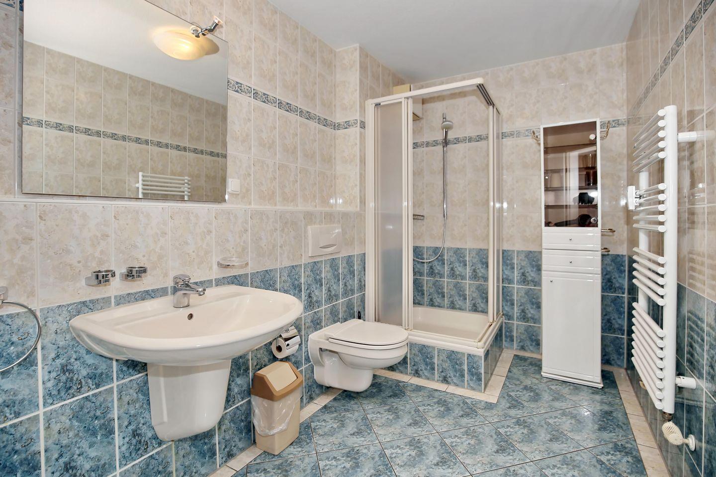 Das Badezimmer ist mit einer Dusche / WC versehen und gefliest. Zur Ausstattung gehört außerdem ein Föhn. Die gesamte Ferienwohnung wurde gefliest.