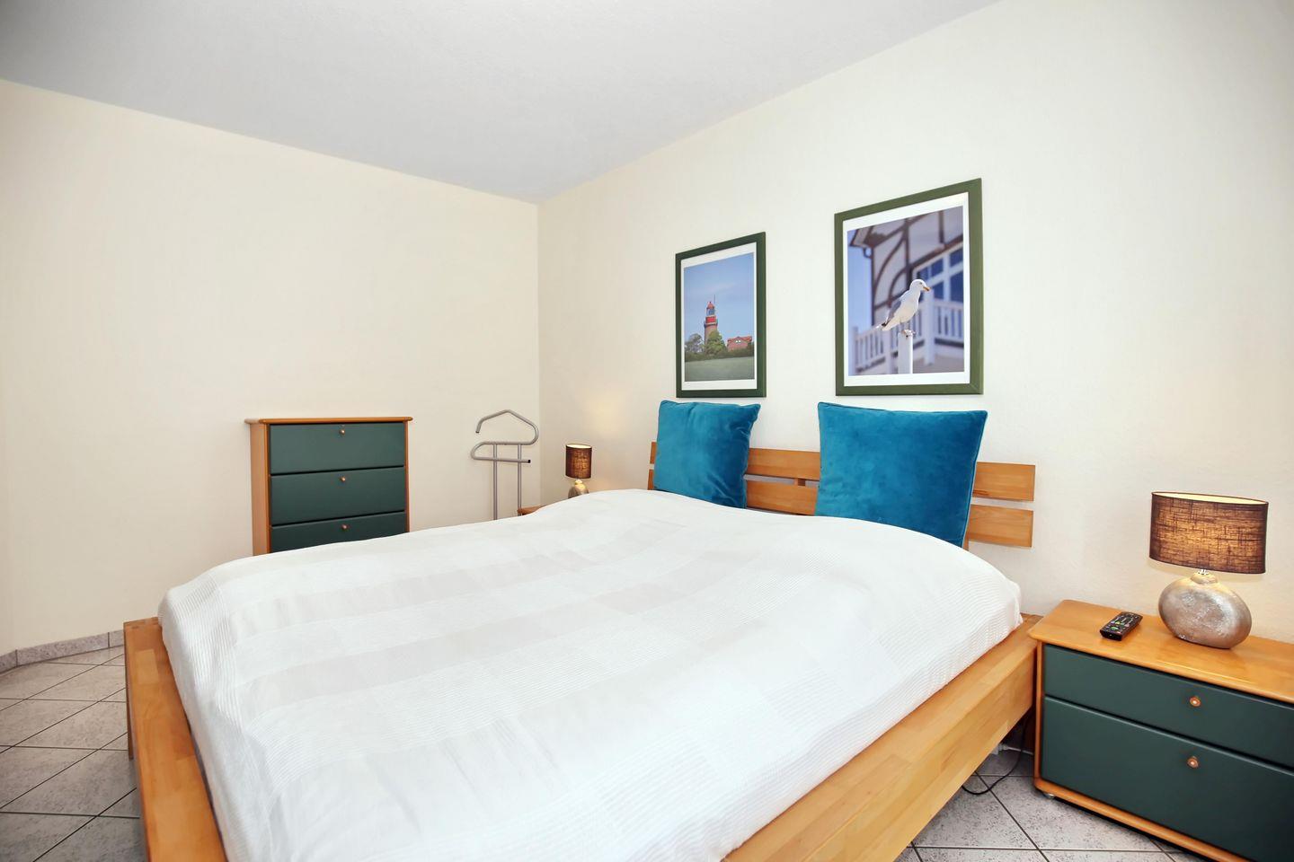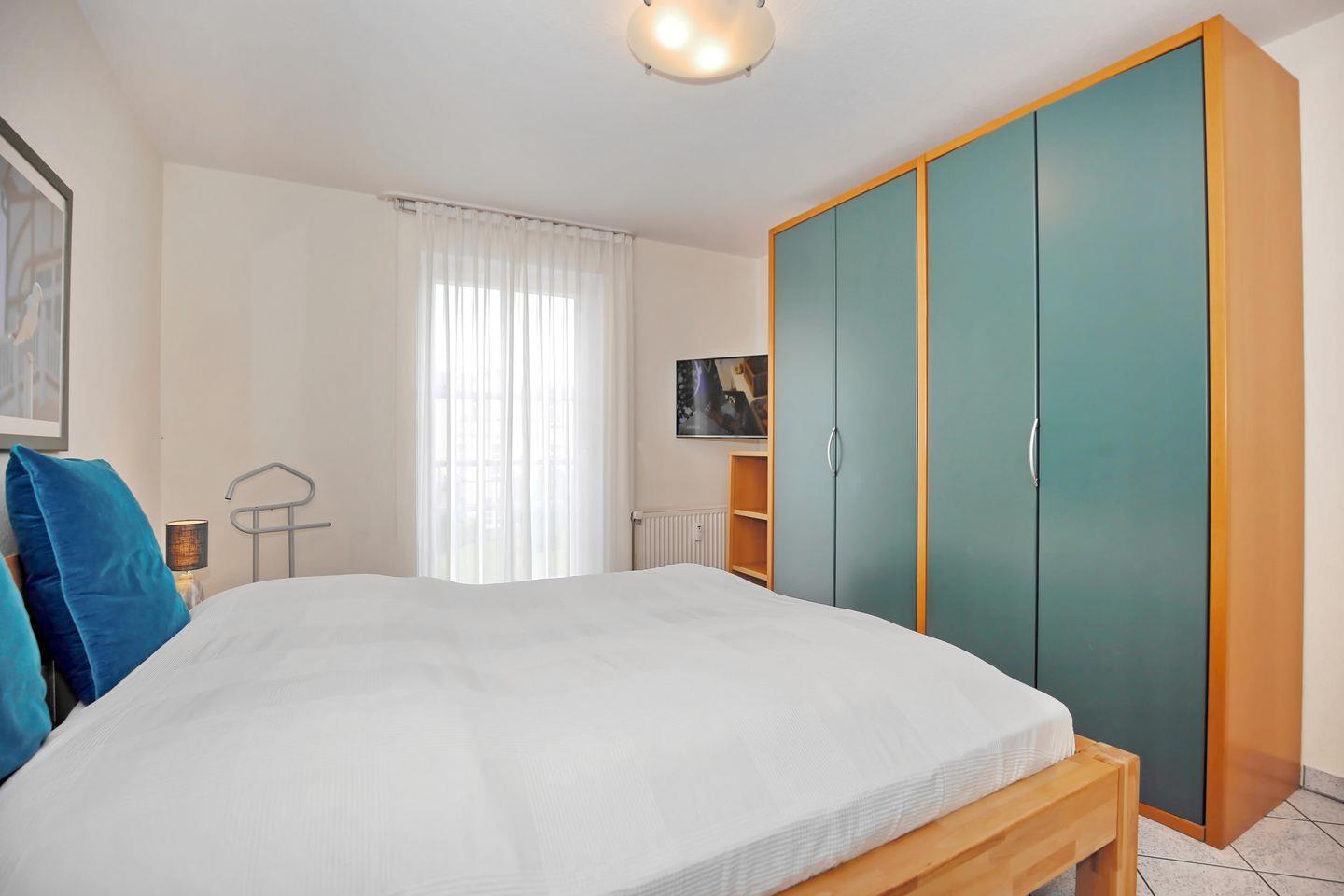 Im Schlafzimmer der Ferienwohnung befinden sich ein Doppelbett (2 x 90 x 200 cm), ein 2. TV und ein Kleiderschrank. Für deine Reiseutensilien ist hier ausreichend Platz. An den Fenstern der gesamten Wohnung hängen Gardinen und Rollos als Sichtschutz und Verdunkelungsmöglichkeit.