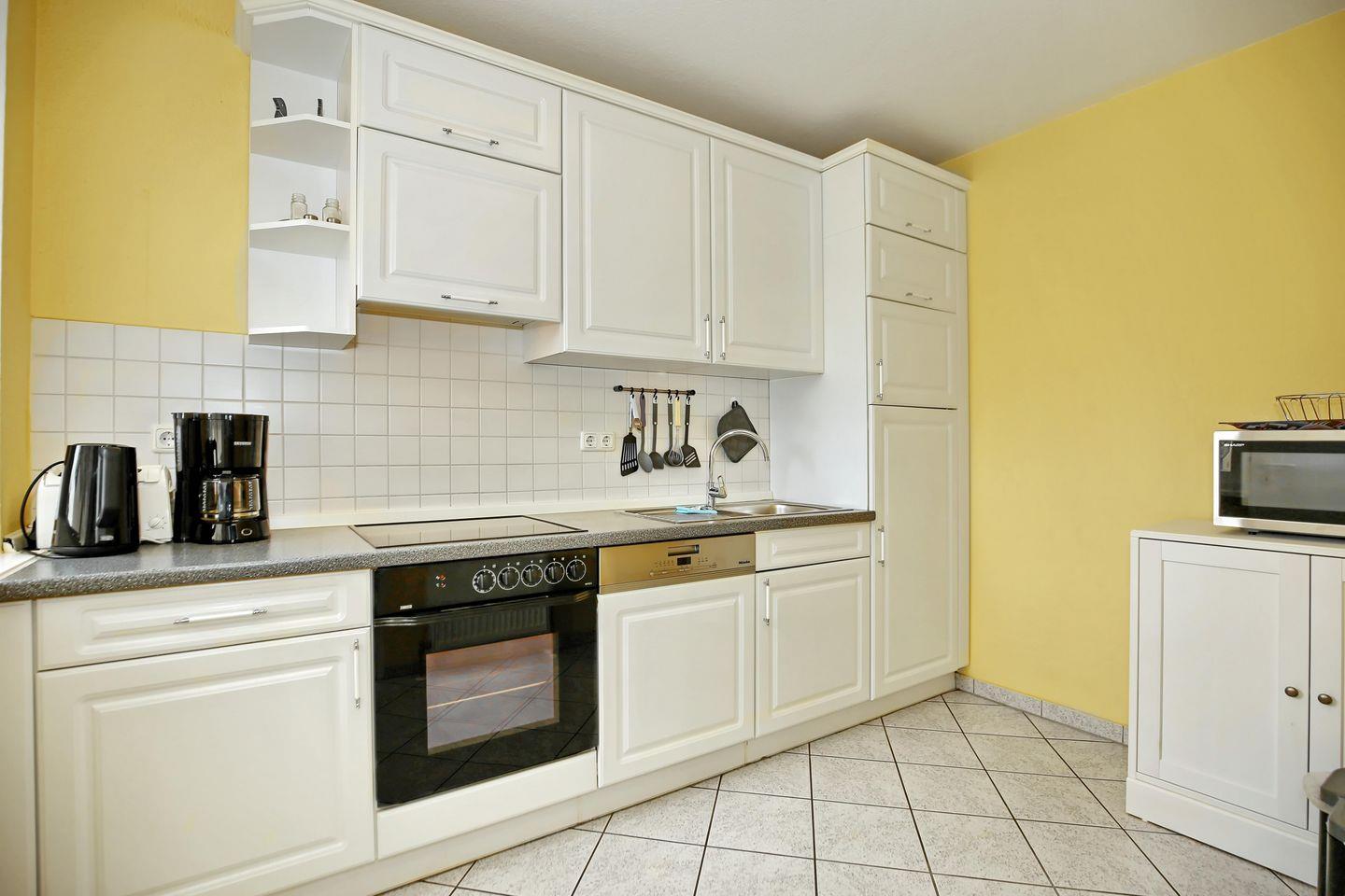 Die Küche ist getrennt vom Wohnbereich und vollständig mit einem Kühlschrank mit Gefrierfach, 4-Ceran-Kochfeldern, einem Backofen, einer Kaffeemaschine, einem Toaster und einem Wasserkocher ausgestattet. Zusätzlicher Stauraum wird in einem Abstellraum neben dem Wohnbereich geboten.