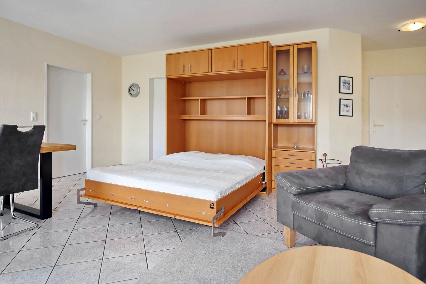 Verbringe auf dem Sofa und den zwei Sesseln gemütliche Stunden. Zur Unterhaltung stehen ein Flachbild-TV, ein Blu-Ray-Player und eine Stereoanlage bereit. Ein Wandklappbett (2 x 80 x 200 cm) für zwei Personen befindet sich ebenfalls im Wohnbereich. Der große Esstisch bietet reichlich Platz für gemeinsame Mahlzeiten oder Spieleabende mit der Familie.