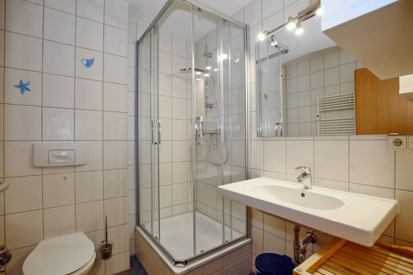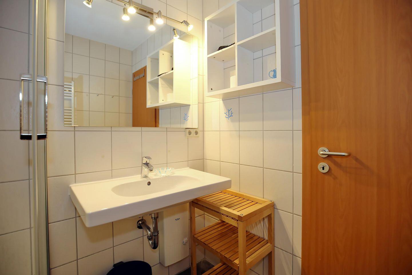 Das Bad mit WC und Dusche verfügt über einen Waschtisch mit beleuchtetem Spiegel sowie einen Handtuchtrockner und ein kleines Regal. Design-Belag ist in der Wohnung verlegt. Das Duschbad und der Bereich vor der Küchenzeile sind gefliest. Rauchen ist in dieser Ferienwohnung nicht gestattet. Haustiere sind nicht erlaubt.