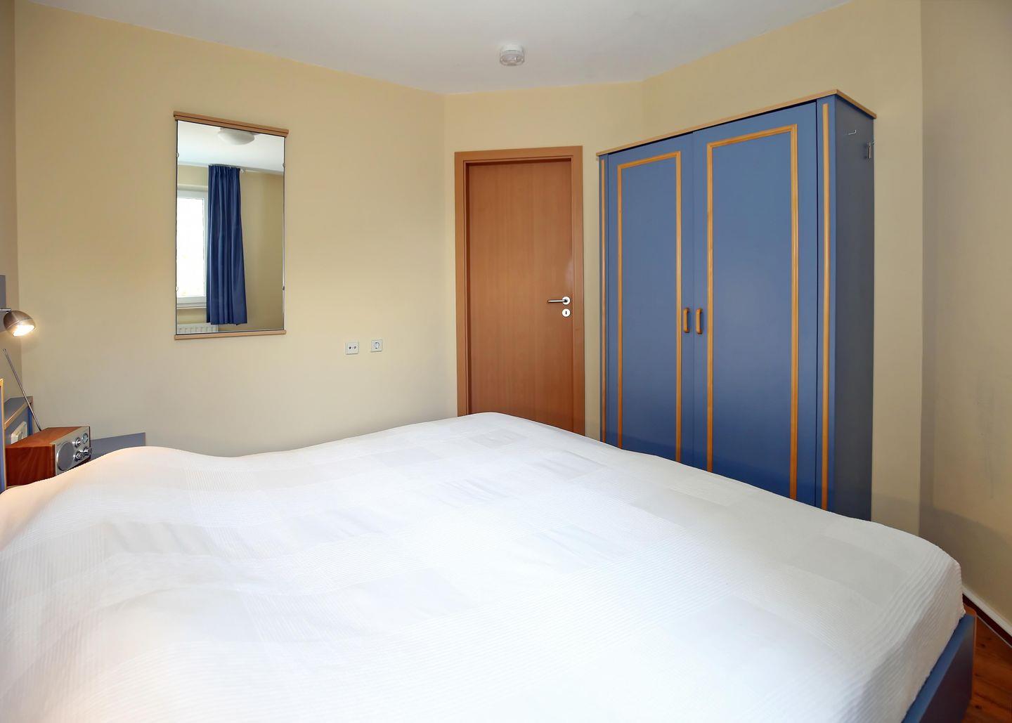 Dein Schlafzimmer ist mit einem bequemen Doppelbett (2 x 90 x 200 cm), zwei Nachtschränken und einem Kleiderschrank ausgestattet. Vorhänge sind vorhanden, um das Zimmer abzudunkeln.