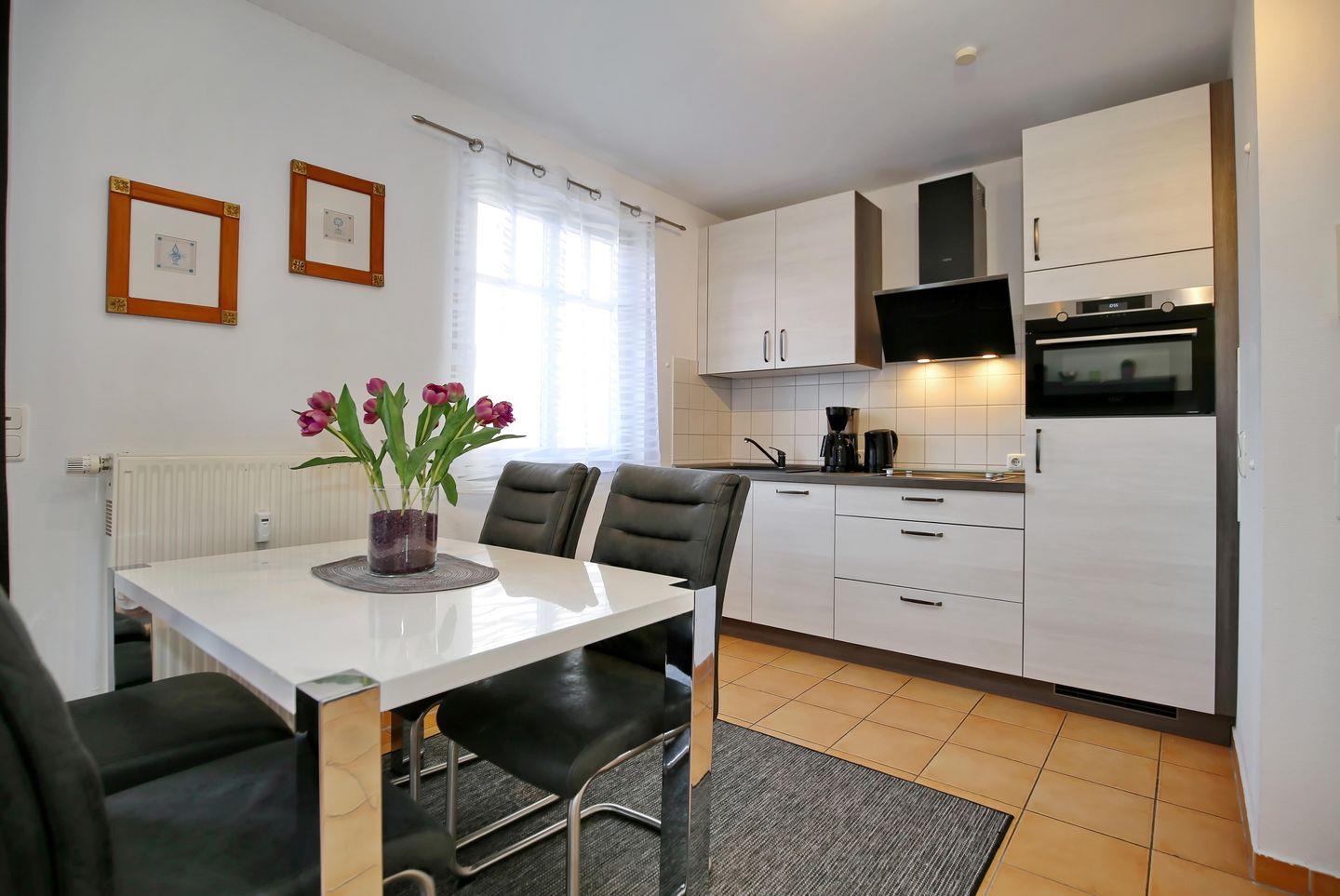 Die offene Küchenzeile im Wohnraum ist mit 4 Kochfeldern, einem Backofen, einer Mikrowelle, einem Kühlschrank mit Gefrierfach sowie einem Toaster, einem Wasserkocher und einer Kaffeemaschine ausgestattet.