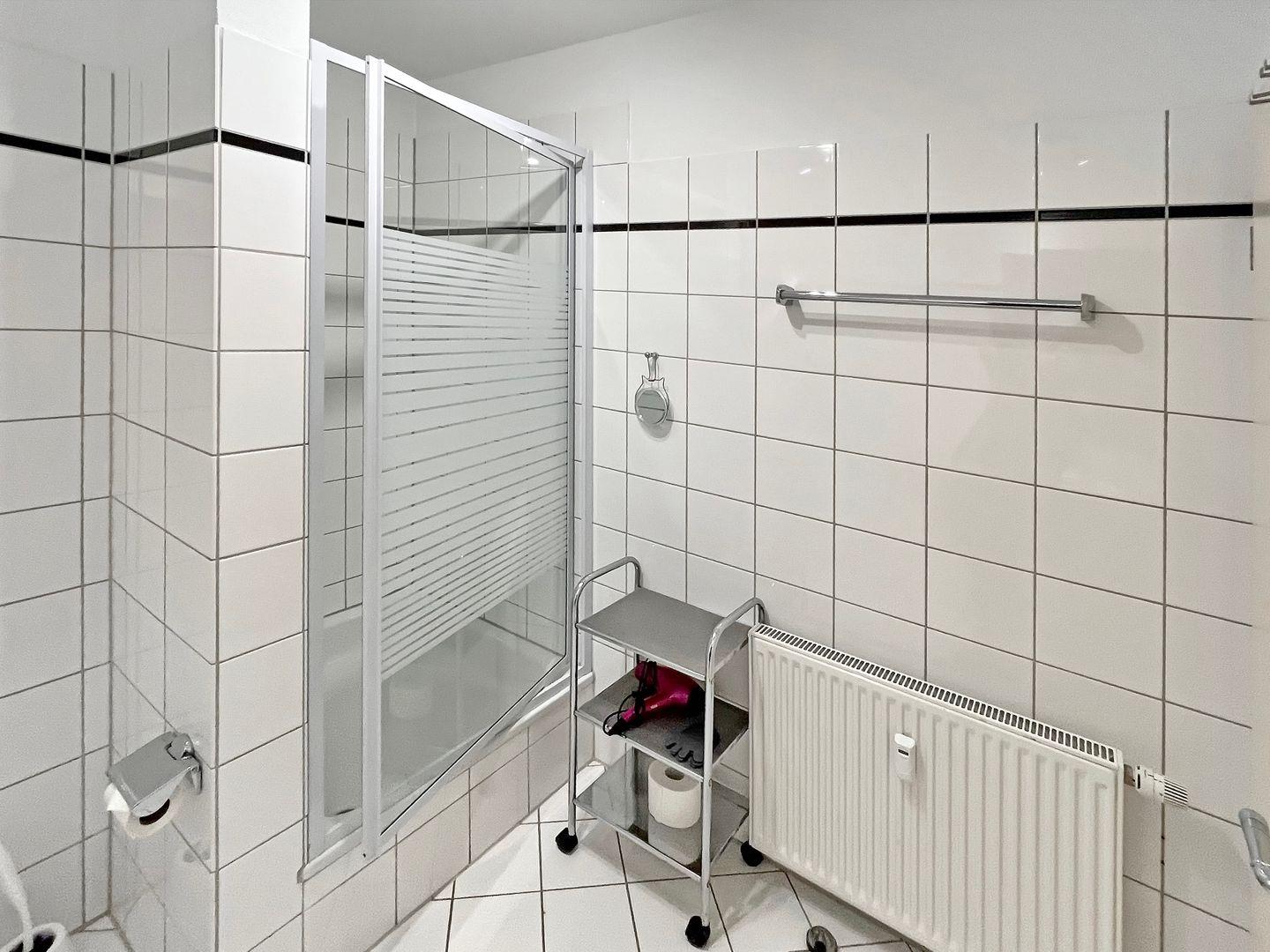 Die Ferienwohnung verfügt selbstverständlich auch über ein Duschbad/WC. Als Bodenbelag findest du im Wohn- und Nassbereich Fliesen vor. Im Schlafzimmer liegt ein Teppichboden.
