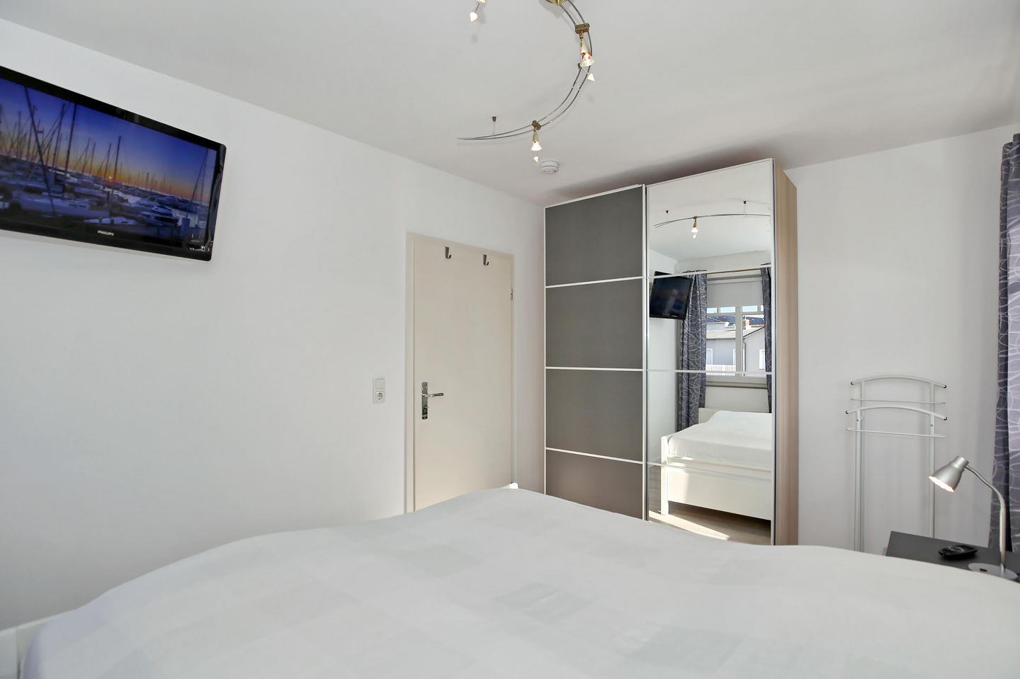 Entspannen kannst du auch im Schlafzimmer im großen Doppelbett (2 x 90 x 200 cm). Im Kleiderschrank findet deine Garderobe und sonstigen Reiseutensilien Platz. Hier steht dir ein zweiter Flachbild-TV zur Verfügung. Als Verdunklungsmöglichkeit dienen Vorhänge.