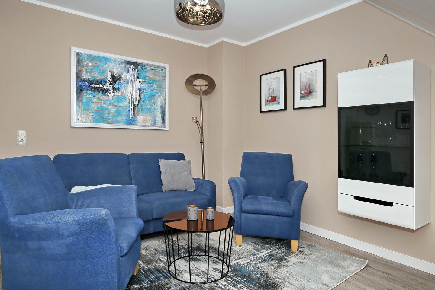 Der Wohnbereich ist mit einer Couch, zwei Sesseln und einem Flachbild-TV ausgestattet. Der Essbereich ist hier integriert. Die Küchenzeile beinhaltet ein 4-Platten-Cerankochfeld, einen Geschirrspüler, einen Wasserkocher, eine Kaffeemaschine, einen Toaster sowie einen großzügigen Kühlschrank mit Gefrierfach.