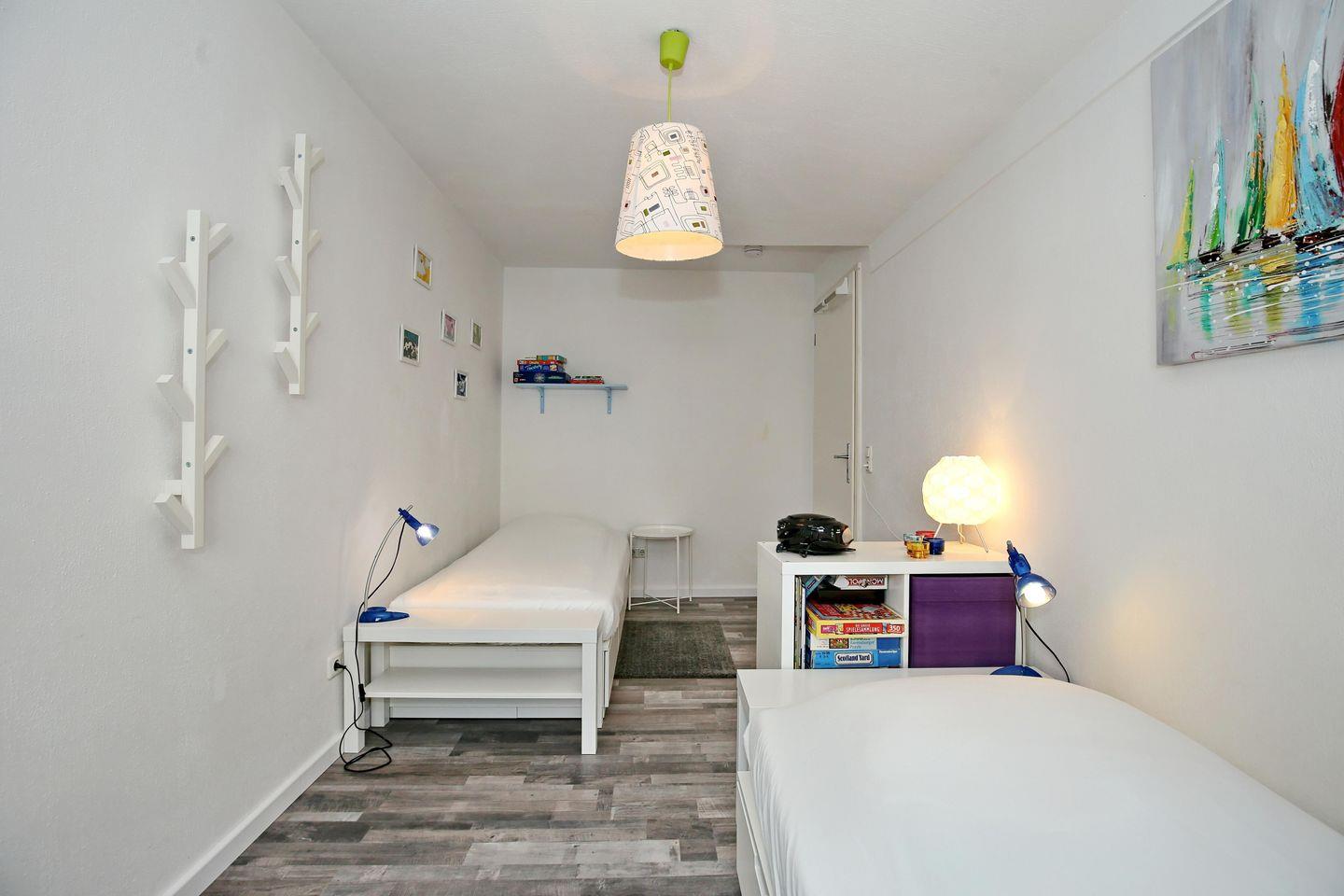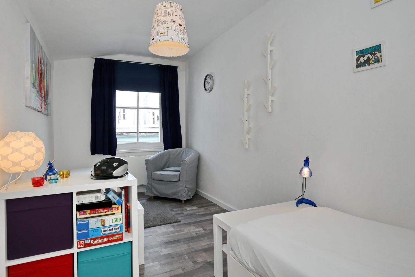 Gleich gegenüber liegt das zweite Schlafzimmer mit zwei Einzelbetten (90 x 200 cm). Eine Besonderheit ist ein Kinderhochstuhl sowie ein Kinderreisebett, welche zur Ausstattung der Wohnung gehören. Nutze die Spiele für gesellige Abende in der Ferienwohnung. An den Fenstern beider Schlafzimmer hängen Vorhänge zur Verdunklung.