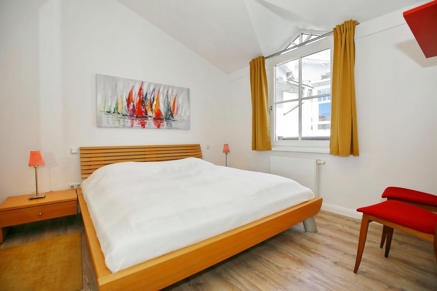 Im ersten Schlafzimmer befindet sich ein großes Doppelbett mit getrennten Matratzen (2 x 90 x 200 cm). Nachtkonsolen und ein geräumiger Kleiderschrank stehen für deine Urlaubsbekleidung bereit.