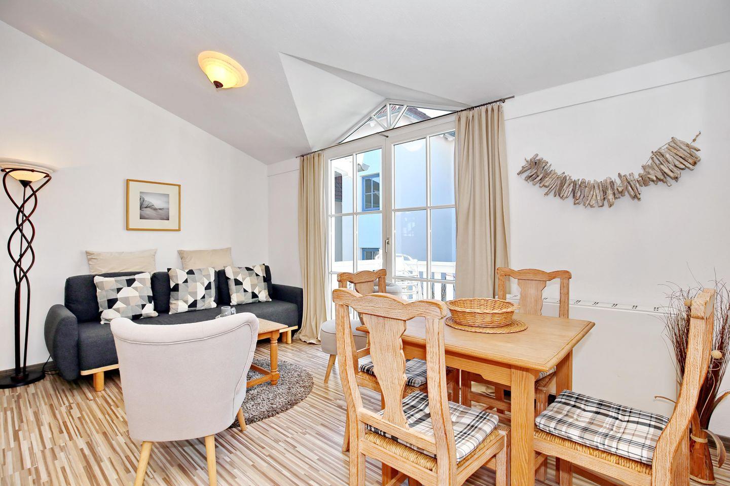 Im gemütlichen Wohnbereich stehen dir neben einer bequemen Couch und zwei Sesseln auch ein Radio, ein DVD-Player und ein Flachbild-TV zur Verfügung. Betrete von hier aus den Balkon und genieße die frische Ostseeluft. Des Weiteren steht dir kostenfreies WLAN in der Wohnung zur Verfügung.