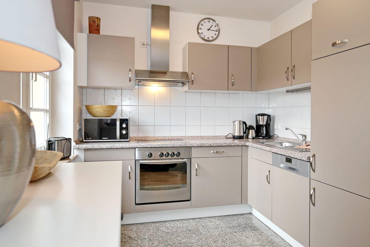 Die Küchenzeile der Ferienwohnung ist für dich mit einem Backofen, einem 4-Zonen-Cerankochfeld, einem Kühlschrank mit Gefrierfach sowie einem Geschirrspüler und einer Mikrowelle voll ausgestattet. Kleingeräte, wie ein Toaster, ein Eierkocher, eine Kaffeemaschine, eine Kaffeekapselmaschine (Nespresso Essenza Mini) und ein Wasserkocher, vervollständigen die Kücheneinrichtung.