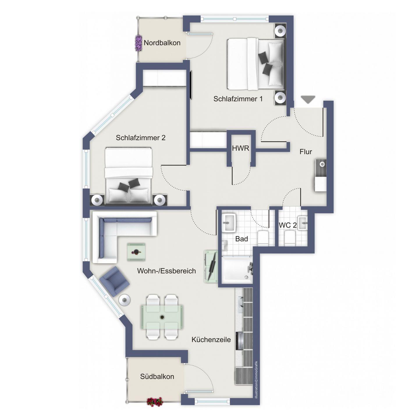 Deine Ferienwohnung befindet sich im 1. Obergeschoss, auf der Nordseite des Hauses und verfügt über zwei Balkone, wovon einer mit Teilseeblick ist. Mit einer Größe von 60 m² bietet die Wohnung mit einem Wohnbereich, einem Essbereich, zwei Schlafzimmern, einer Küchenzeile und einem Duschbad viel Platz für einen erholsamen Ostseeurlaub. Die Entfernung zum Strand beträgt etwa 100 Meter.