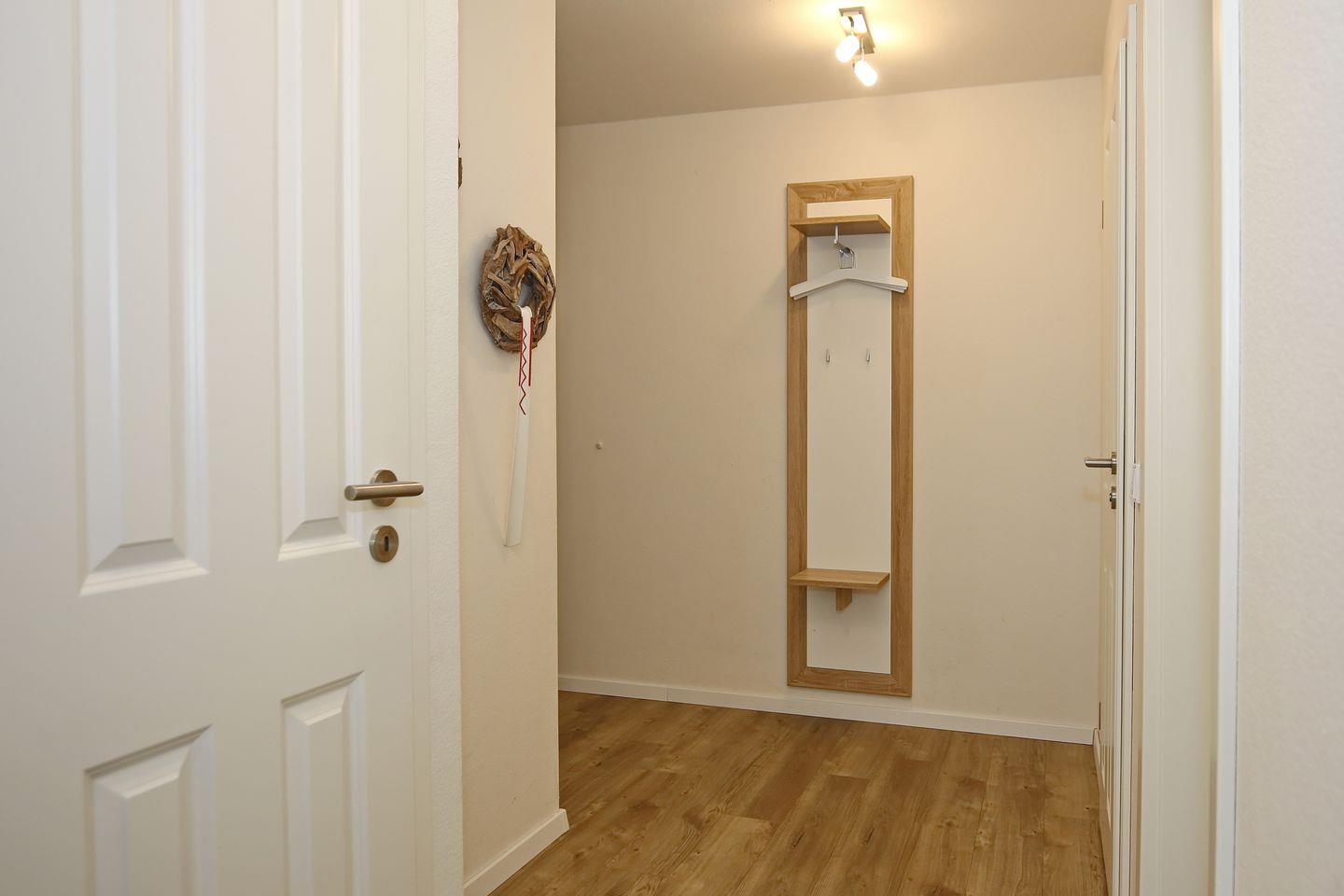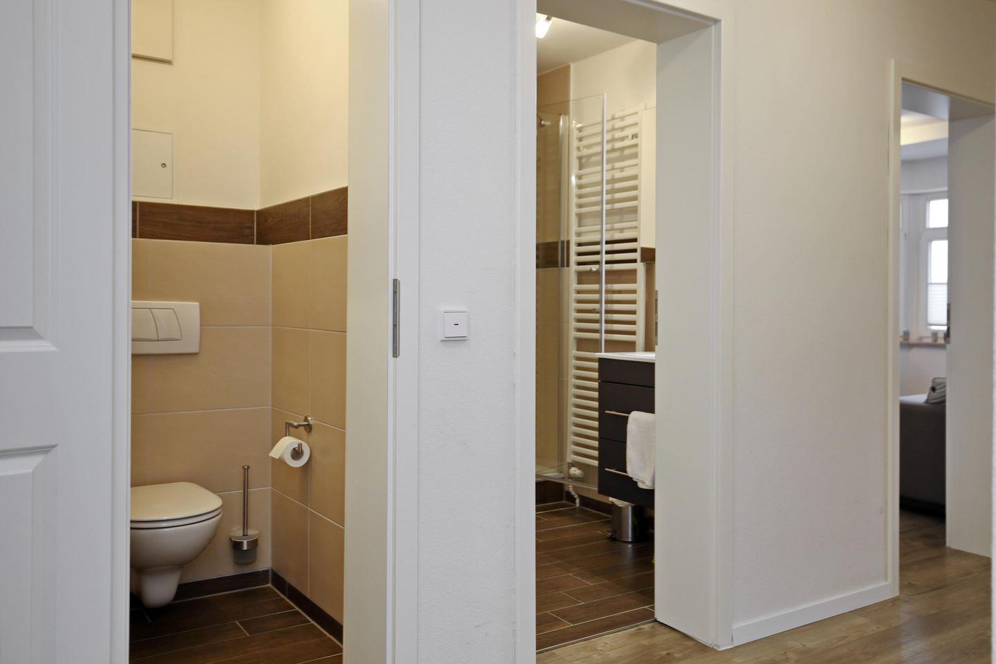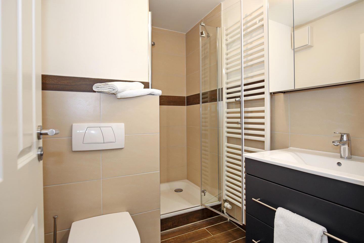 Die Ferienwohnung verfügt über ein gefliestes Duschbad mit WC. Für deine Waschutensilien findest du genügend Platz auf dem großzügigen Waschtisch. Vom Flur aus erreichst du das Gäste-WC und einen kleinen Abstellraum. In der gesamten Wohnung wurde ein Vinyl-Boden verlegt. In dieser Nichtraucherwohnung sind Haustiere nicht erlaubt.