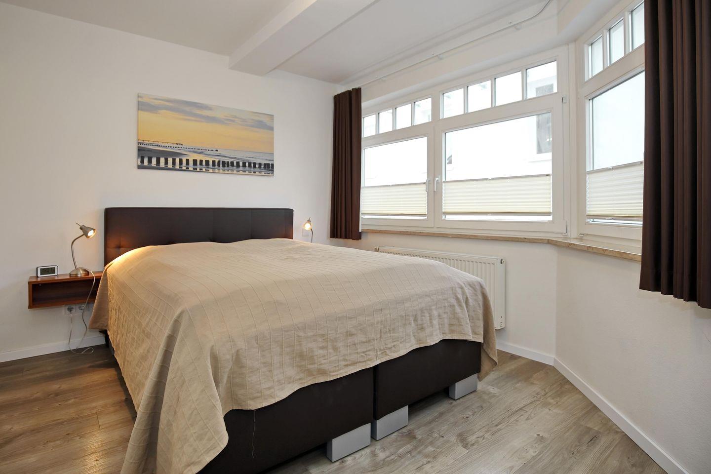 Im ersten Schlafzimmer dieser Ferienwohnung lädt ein gemütliches Boxspringbett (1 x 160 cm x 200 cm) zum erholsamen Schlaf ein. Ein Kleiderschrank und zwei Nachtschränke bieten dir viel Stauraum. Ein Flachbild-TV und Verdunklungsmöglichkeiten runden das Gesamtbild ab. Im zweiten Schlafzimmer stehen ebenfalls ein Boxspringbett (1 x 160 cm x 200 cm) und ein Kleiderschrank für dich bereit.