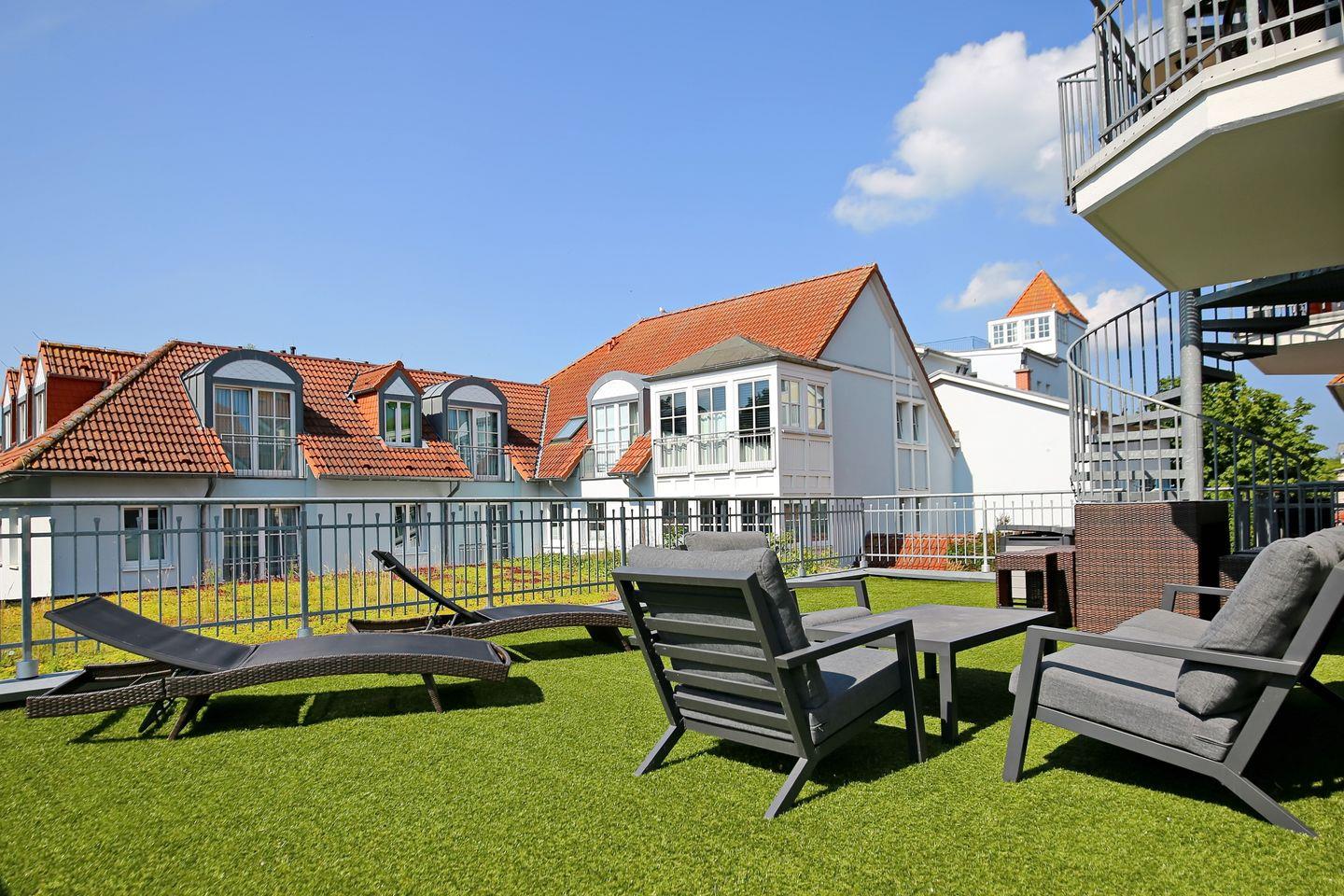 Deine Ferienwohnung befindet sich im 1. Obergeschoss und verfügt über eine 60 m² große Südterrasse mit teils seitlichem Meerblick sowie gemütlichen Loungemöbeln. Mit einer Wohnfläche von 83 m² bietet die Wohnung mit einem Wohn- und Essbereich, zwei geräumigen Schlafzimmern, einer Küchenzeile und einem Duschbad sowie einem Gäste-WC viel Platz für einen erholsamen und komfortablen Ostseeurlaub. Die Entfernung zum Strand beträgt etwa 100 Meter.