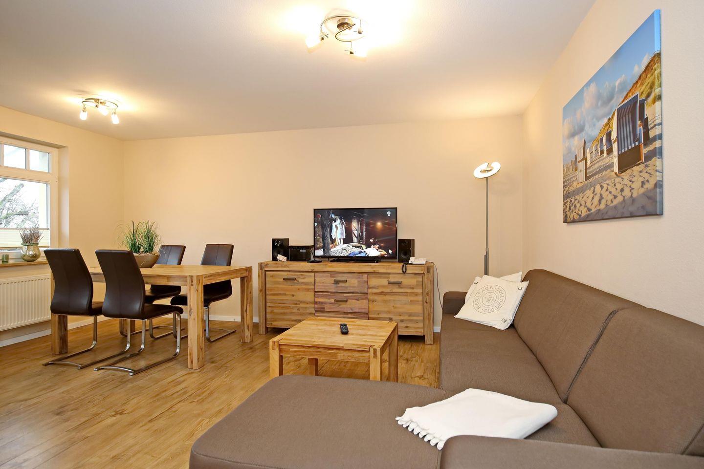 Der sehr moderne Wohnraum der Ferienwohnung lädt mit einer gemütlichen Schlafcouch (160 cm x 200 cm) und einem modernen Flachbild-TV sowie einer Stereo-Anlage zum Verweilen ein. Von hier aus gelangst du auf den Balkon zur Nordseite. Am Esstisch hast du genügend Platz für gemeinsame Mahlzeiten.